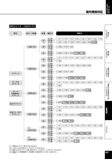 インダクションギアモータオプション技術資料F2/F3タイプ同心中空軸・同心中実軸F/FAタイプ中空軸・中実軸H/H2タイプ直交軸G/G3タイプ平行軸1/51/101/151/201/251/301/401/501/601/801/1001/1201/1601/2001/2401/3001/3751/4501/6001/7501/9001/12001/15001/51/101/151/201/251/301/401/501/601/801/1001/1201/1601/2001/2401/3001/3751/4501/6001/7501/9001/12001/15001/51/101/151/201/251/301/401/501/601/801/1001/1201/1601/2001/2401/3001/3751/4501/6001/7501/9001/12001/15001/51/101/151/201/251/301/401/501/601/801/1001/1201/1601/2001/2401/3001/3751/4501/51/101/151/201/251/301/401/501/601/801/1001/1201/1601/2001/2401/51/101/151/201/251/301/401/501/601/801/1001/120HMBHMBHMBHMBHMBHMBHMBHMBHMBHMBHMBHMBHMBHMBHMBHMBHMBLRTLRTLRTLRTLRTLRTLRTLRTLRTLRTLRTLRTLRTLRTLRTLRTLRT22(注1)283222(注1)28324028324050324050405050三相0.1kW三相0.2kW三相0.4kWギアモータブレーキ付ギアモータブレーキ手動解放付ギアモータ防水ギアモータ防水ブレーキ付ギアモータ三相0.75kW(注2)三相1.5kW(注2)三相2.2kWMIDシリーズ<H2タイプ>型式4Pモータ容量枠番軸区分減速比注1.枠番22のみフランジ取付(H2F)もあります。注2.1.5kW、2.2kWの防水ブレーキ付ギアモータはありません。注3.軸区分H・M・B(ステンレス鋼)は防水ギアモータ、防水ブレーキ付ギアモータとなります。注4.はトルク制限機種です。性能表の出力軸許容トルクに特にご注意ください。607