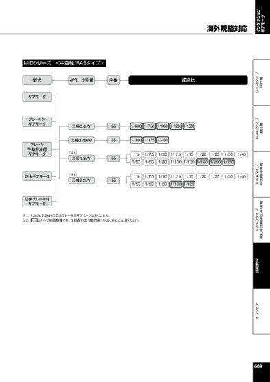 インダクションギアモータオプション技術資料F2/F3タイプ同心中空軸・同心中実軸F/FAタイプ中空軸・中実軸H/H2タイプ直交軸G/G3タイプ平行軸MIDシリーズ<中空軸/FASタイプ>型式4Pモータ容量枠番減速比ギアモータブレーキ付ギアモータブレーキ手動解放付ギアモータ防水ギアモータ防水ブレーキ付ギアモータ三相0.4kW三相0.75kW(注1)三相1.5kW(注1)三相2.2kW555555551/6001/7501/9001/12001/15001/3001/3751/4501/51/7.51/501/601/101/801/12.51/151/201/251/301/401/1001/1201/1601/2001/2401/51/7.51/501/601/101/801/12.51/151/201/251/301/401/1001/120注1.1.5kW、2.2kWの防水ブレーキ付ギアモータはありません。注2.はトルク制限機種です。性能表の出力軸許容トルクに特にご注意ください。609