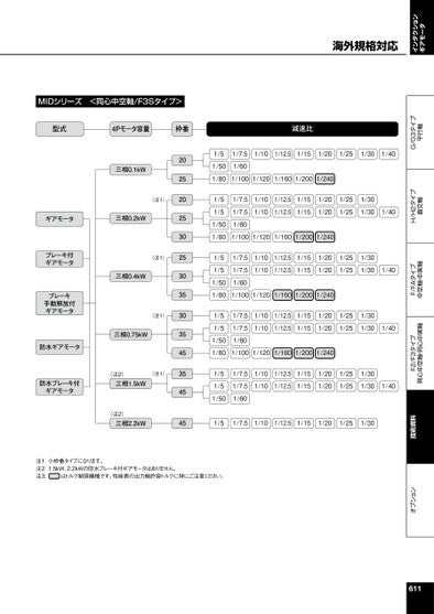 インダクションギアモータオプション技術資料F2/F3タイプ同心中空軸・同心中実軸F/FAタイプ中空軸・中実軸H/H2タイプ直交軸G/G3タイプ平行軸MIDシリーズ<同心中空軸/F3Sタイプ>型式4Pモータ容量枠番減速比三相0.1kWギアモータ三相0.2kWブレーキ付ギアモータブレーキ手動解放付ギアモータ防水ギアモータ防水ブレーキ付ギアモータ(注1)(注1)(注1)三相0.4kW三相0.75kW(注2)(注1)三相1.5kW(注2)三相2.2kW20252025302530353035453545451/51/7.51/101/12.51/151/201/251/301/401/501/601/801/1001/1201/1601/2001/2401/51/51/7.51/7.51/101/101/12.51/151/12.51/151/201/201/251/251/301/301/401/501/601/801/1001/1201/1601/2001/2401/51/51/7.51/7.51/101/101/12.51/151/12.51/151/201/201/251/251/301/301/401/501/601/801/1001/1201/1601/2001/2401/51/51/7.51/7.51/101/101/12.51/151/12.51/151/201/201/251/251/301/301/401/501/601/801/1001/1201/1601/2001/2401/51/51/7.51/7.51/101/101/12.51/151/12.51/151/201/201/251/251/301/301/401/501/601/51/7.51/101/12.51/151/201/251/30注1.小枠番タイプになります。注2.1.5kW、2.2kWの防水ブレーキ付ギアモータはありません。注3.はトルク制限機種です。性能表の出力軸許容トルクに特にご注意ください。611