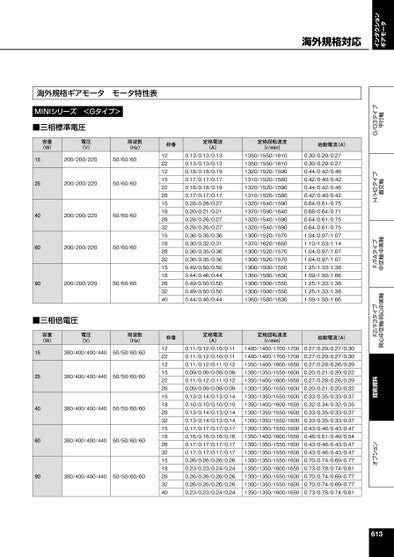 インダクションギアモータオプション技術資料F2/F3タイプ同心中空軸・同心中実軸F/FAタイプ中空軸・中実軸H/H2タイプ直交軸G/G3タイプ平行軸海外規格ギアモータモータ特性表MINIシリーズ<Gタイプ>■三相標準電圧容量(W)電圧(V)周波数(Hz)枠番定格電流(A)15254060200/200/22050/60/60200/200/22050/60/60200/200/22050/60/60200/200/22050/60/6090200/200/22050/60/60122212152228151828321518283215182832400.13/0.13/0.130.13/0.13/0.130.18/0.18/0.190.17/0.17/0.170.18/0.18/0.190.17/0.17/0.170.28/0.26/0.270.20/0.21/0.210.28/0.26/0.270.28/0.26/0.270.36/0.35/0.360.30/0.32/0.310.36/0.35/0.360.36/0.35/0.360.49/0.50/0.500.44/0.46/0.440.49/0.50/0.500.49/0.50/0.500.44/0.46/0.44■三相倍電圧容量(W)電圧(V)周波数(Hz)枠番定格電流(A)15254060380/400/400/44050/50/60/60380/400/400/44050/50/60/60380/400/400/44050/50/60/60380/400/400/44050/50/60/6090380/400/400/44050/50/60/60122212152228151828321518283215182832400.11/0.12/0.10/0.110.11/0.12/0.10/0.110.11/0.12/0.11/0.120.09/0.09/0.09/0.090.11/0.12/0.11/0.120.09/0.09/0.09/0.090.13/0.14/0.13/0.140.10/0.10/0.10/0.100.13/0.14/0.13/0.140.13/0.14/0.13/0.140.17/0.17/0.17/0.170.16/0.16/0.16/0.160.17/0.17/0.17/0.170.17/0.17/0.17/0.170.26/0.26/0.26/0.260.23/0.23/0.24/0.240.26/0.26/0.26/0.260.26/0.26/0.26/0.260.23/0.23/0.24/0.24定格回転速度(r/min)1350/1550/16101350/1550/16101320/1520/15901310/1520/15801320/1520/15901310/1520/15801320/1540/15901370/1590/16401320/1540/15901320/1540/15901300/1520/15701370/1620/16501300/1520/15701300/1520/15701300/1500/15501360/1580/16301300/1500/15501300/1500/15501360/1580/1630始動電流(A)0.30/0.29/0.270.30/0.29/0.270.44/0.42/0.460.42/0.40/0.420.44/0.42/0.460.42/0.40/0.420.64/0.61/0.750.68/0.64/0.710.64/0.61/0.750.64/0.61/0.751.04/0.97/1.071.10/1.03/1.141.04/0.97/1.071.04/0.97/1.071.25/1.33/1.381.59/1.50/1.661.25/1.33/1.381.25/1.33/1.381.59/1.50/1.66定格回転速度(r/min)1400/1400/1700/17001400/1400/1700/17001350/1400/1600/16501300/1350/1550/16001350/1400/1600/16501300/1350/1550/16001300/1350/1550/16001350/1400/1600/16501300/1350/1550/16001300/1350/1550/16001300/1350/1550/16001350/1400/1600/16501300/1350/1550/16001300/1350/1550/16001300/1350/1550/16001350/1350/1600/16501300/1350/1550/16001300/1350/1550/16001350/1350/1600/1650始動電流(A)0.27/0.29/0.27/0.300.27/0.29/0.27/0.300.27/0.28/0.26/0.290.20/0.21/0.20/0.220.27/0.28/0.26/0.290.20/0.21/0.20/0.220.33/0.35/0.33/0.370.32/0.34/0.32/0.350.33/0.35/0.33/0.370.33/0.35/0.33/0.370.43/0.46/0.43/0.470.48/0.51/0.49/0.540.43/0.46/0.43/0.470.43/0.46/0.43/0.470.70/0.74/0.69/0.770.73/0.78/0.74/0.810.70/0.74/0.69/0.770.70/0.74/0.69/0.770.73/0.78/0.74/0.81613