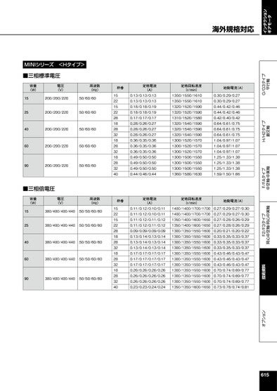 インダクションギアモータオプション技術資料F2/F3タイプ同心中空軸・同心中実軸F/FAタイプ中空軸・中実軸H/H2タイプ直交軸G/G3タイプ平行軸MINIシリーズ<Hタイプ>■三相標準電圧容量(W)電圧(V)周波数(Hz)枠番1525406090200/200/22050/60/60200/200/22050/60/60200/200/22050/60/60200/200/22050/60/60200/200/22050/60/60152215222818283218283218283240定格電流(A)0.13/0.13/0.130.13/0.13/0.130.18/0.18/0.190.18/0.18/0.190.17/0.17/0.170.28/0.26/0.270.28/0.26/0.270.28/0.26/0.270.36/0.35/0.360.36/0.35/0.360.36/0.35/0.360.49/0.50/0.500.49/0.50/0.500.49/0.50/0.500.44/0.46/0.44定格回転速度(r/min)1350/1550/16101350/1550/16101320/1520/15901320/1520/15901310/1520/15801320/1540/15901320/1540/15901320/1540/15901300/1520/15701300/1520/15701300/1520/15701300/1500/15501300/1500/15501300/1500/15501360/1580/1630始動電流(A)0.30/0.29/0.270.30/0.29/0.270.44/0.42/0.460.44/0.42/0.460.42/0.40/0.420.64/0.61/0.750.64/0.61/0.750.64/0.61/0.751.04/0.97/1.071.04/0.97/1.071.04/0.97/1.071.25/1.33/1.381.25/1.33/1.381.25/1.33/1.381.59/1.50/1.66■三相倍電圧容量(W)電圧(V)周波数(Hz)枠番定格電流(A)1525406090380/400/400/44050/50/60/60380/400/400/44050/50/60/60380/400/400/44050/50/60/60380/400/400/44050/50/60/60380/400/400/44050/50/60/601522152228182832182832182832400.11/0.12/0.10/0.110.11/0.12/0.10/0.110.11/0.12/0.11/0.120.11/0.12/0.11/0.120.09/0.09/0.09/0.090.13/0.14/0.13/0.140.13/0.14/0.13/0.140.13/0.14/0.13/0.140.17/0.17/0.17/0.170.17/0.17/0.17/0.170.17/0.17/0.17/0.170.26/0.26/0.26/0.260.26/0.26/0.26/0.260.26/0.26/0.26/0.260.23/0.23/0.24/0.24定格回転速度(r/min)1400/1400/1700/17001400/1400/1700/17001350/1400/1600/16501350/1400/1600/16501300/1350/1550/16001300/1350/1550/16001300/1350/1550/16001300/1350/1550/16001300/1350/1550/16001300/1350/1550/16001300/1350/1550/16001300/1350/1550/16001300/1350/1550/16001300/1350/1550/16001350/1350/1600/1650始動電流(A)0.27/0.29/0.27/0.300.27/0.29/0.27/0.300.27/0.28/0.26/0.290.27/0.28/0.26/0.290.20/0.21/0.20/0.220.33/0.35/0.33/0.370.33/0.35/0.33/0.370.33/0.35/0.33/0.370.43/0.46/0.43/0.470.43/0.46/0.43/0.470.43/0.46/0.43/0.470.70/0.74/0.69/0.770.70/0.74/0.69/0.770.70/0.74/0.69/0.770.73/0.78/0.74/0.81615