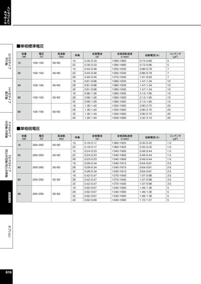 インダクションギアモータG/G3タイプ平行軸H/H2タイプ直交軸F/FAタイプ中空軸・中実軸F2/F3タイプ同心中空軸・同心中実軸技術資料オプション■単相標準電圧容量(W)電圧(V)周波数(Hz)枠番定格電流(A)定格回転速度(r/min)始動電流(A)コンデンサ(μF)1525406090100/10050/60100/10050/60100/10050/60100/10050/60100/10050/60■単相倍電圧1522152228182832182832182832400.35/0.330.35/0.330.45/0.480.45/0.480.45/0.450.61/0.660.61/0.660.61/0.660.90/1.000.90/1.000.90/1.001.30/1.401.30/1.401.30/1.401.20/1.401390/16801390/16801350/16301350/16301370/16401380/16301380/16301380/16301380/16501380/16501380/16501350/16001350/16001350/16001400/16800.73/0.660.73/0.660.86/0.790.86/0.791.01/0.931.47/1.341.47/1.341.47/1.342.13/1.952.13/1.952.13/1.952.90/2.702.90/2.702.90/2.703.32/3.105577710101015151520202020容量(W)電圧(V)周波数(Hz)枠番定格電流(A)定格回転速度(r/min)始動電流(A)コンデンサ(μF)1525406090200/20050/60200/20050/60200/20050/60200/20050/60200/20050/601522152228182832182832182832400.18/0.170.18/0.170.24/0.230.24/0.230.23/0.230.29/0.340.29/0.340.29/0.340.42/0.470.42/0.470.42/0.470.62/0.670.62/0.670.62/0.670.62/0.691360/16201360/16201340/16001340/16001340/16001340/16101340/16101340/16101370/16401370/16401370/16401340/16001340/16001340/16001400/16800.35/0.320.35/0.320.48/0.440.48/0.440.49/0.440.64/0.610.64/0.610.64/0.611.07/0.981.07/0.981.07/0.981.46/1.361.46/1.361.46/1.361.72/1.571.01.01.51.51.52.52.52.53.53.53.55555616