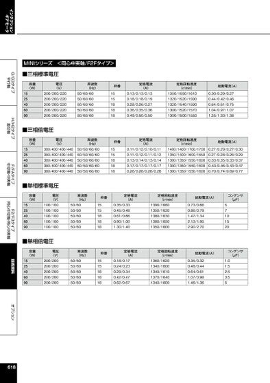 インダクションギアモータG/G3タイプ平行軸H/H2タイプ直交軸F/FAタイプ中空軸・中実軸F2/F3タイプ同心中空軸・同心中実軸技術資料オプションMINIシリーズ<同心中実軸/F2Fタイプ>■三相標準電圧容量(W)1525406090電圧(V)200/200/220200/200/220200/200/220200/200/220200/200/220■三相倍電圧周波数(Hz)枠番50/60/6050/60/6050/60/6050/60/6050/60/601515181818定格電流(A)0.13/0.13/0.130.18/0.18/0.190.28/0.26/0.270.36/0.35/0.360.49/0.50/0.50定格回転速度(r/min)1350/1550/16101320/1520/15901320/1540/15901300/1520/15701300/1500/1550始動電流(A)0.30/0.29/0.270.44/0.42/0.460.64/0.61/0.751.04/0.97/1.071.25/1.33/1.38容量(W)電圧(V)周波数(Hz)枠番定格電流(A)定格回転速度(r/min)始動電流(A)1525406090380/400/400/440380/400/400/440380/400/400/440380/400/400/440380/400/400/44050/50/60/6050/50/60/6050/50/60/6050/50/60/6050/50/60/6015151818180.11/0.12/0.10/0.110.11/0.12/0.11/0.120.13/0.14/0.13/0.140.17/0.17/0.17/0.170.26/0.26/0.26/0.261400/1400/1700/17001350/1400/1600/16501300/1350/1550/16001300/1350/1550/16001300/1350/1550/16000.27/0.29/0.27/0.300.27/0.28/0.26/0.290.33/0.35/0.33/0.370.43/0.46/0.43/0.470.70/0.74/0.69/0.77■単相標準電圧容量(W)電圧(V)周波数(Hz)枠番定格電流(A)定格回転速度(r/min)始動電流(A)コンデンサ(μF)1525406090100/100100/100100/100100/100100/10050/6050/6050/6050/6050/6015151818180.35/0.330.45/0.480.61/0.660.90/1.001.30/1.401390/16801350/16301380/16301380/16501350/16000.73/0.660.86/0.791.47/1.342.13/1.952.90/2.7057101520■単相倍電圧容量(W)電圧(V)周波数(Hz)枠番定格電流(A)定格回転速度(r/min)始動電流(A)コンデンサ(μF)1525406090200/200200/200200/200200/200200/20050/6050/6050/6050/6050/6015151818180.18/0.170.24/0.230.29/0.340.42/0.470.62/0.671360/16201340/16001340/16101370/16401340/16000.35/0.320.48/0.440.64/0.611.07/0.981.46/1.361.01.52.53.55618
