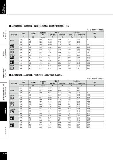 インダクションギアモータG/G3タイプ平行軸H/H2タイプ直交軸F/FAタイプ中空軸・中実軸F2/F3タイプ同心中空軸・同心中実軸技術資料オプション■三相異電圧(二重電圧)韓国・台湾対応【型式(電源電圧):K】モータ単体の代表特性モータ容量電圧V周波数Hz定格回転速度r/min電流特性トルク特性定格電流始動電流始動トルク停動トルクAA%%効率%0.1kW0.2kW0.4kW0.75kW1.5kW2.2kW2203802203802203802203802203802203806060606060606060606060601680168016801680167016701740174017601760177017700.520.300.930.521.71.02.91.75.93.48.34.81.901.103.702.207.104.0916.99.845.125.865.038.0171167196196199197210216239255205230214213232229209208291294373366375360--68.068.072.072.085.585.586.586.589.589.5■三相異電圧(二重電圧)中国対応【型式(電源電圧):C】モータ容量電圧V周波数Hz定格回転速度r/min電流特性トルク特性定格電流始動電流始動トルク停動トルクAA%%効率%モータ単体の代表特性0.1kW0.2kW0.4kW0.75kW1.5kW2.2kW2202303802202303802202303802202303802202303802202303805050505050505050505050505050505050501400141014001400141013901390140013901450145014401450145014501460147014400.550.540.310.990.980.561.81.81.03.03.01.75.95.93.47.97.74.51.942.031.123.974.152.297.637.884.4317.818.710.338.540.422.152.054.330.0180197180192210192194212194233263242214240219209228209224245224230251230225246225315346315312348314306334306---65.965.965.973.573.573.582.582.582.585.385.385.386.786.786.7620