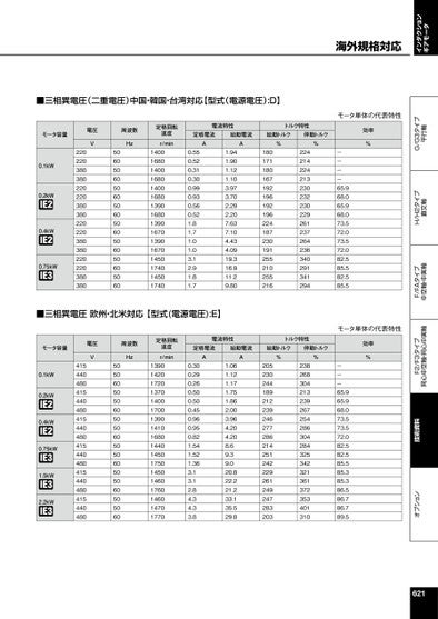 インダクションギアモータオプション技術資料F2/F3タイプ同心中空軸・同心中実軸F/FAタイプ中空軸・中実軸H/H2タイプ直交軸G/G3タイプ平行軸■三相異電圧(二重電圧)中国・韓国・台湾対応【型式(電源電圧):D】モータ容量電圧V周波数Hz定格回転速度r/min電流特性トルク特性定格電流始動電流始動トルク停動トルクAA%%効率%モータ単体の代表特性0.1kW0.2kW0.4kW0.75kW2202203803802202203803802202203803802202203803805060506050605060506050605060506014001680140016801400168013901680139016701390167014501740145017400.550.520.310.300.990.930.560.521.81.71.01.03.12.91.81.71.941.901.121.103.973.702.292.207.637.104.434.0919.316.911.29.80180171180167192196192196224187230191255210255216224214224213230232230229261237264236340291341294----65.968.065.968.073.572.073.572.082.585.582.585.5■三相異電圧欧州・北米対応【型式(電源電圧):E】モータ容量電圧V周波数Hz定格回転速度r/min電流特性トルク特性定格電流始動電流始動トルク停動トルクAA%%効率%モータ単体の代表特性0.1kW0.2kW0.4kW0.75kW1.5kW2.2kW4154404804154404804154404804154404804154404804154404805050605050605050605050605050605050601390142017201370140017001390141016801440145017501450146017601460147017700.300.290.260.500.500.450.960.950.821.541.521.363.13.12.84.34.33.81.061.121.171.751.862.003.964.204.208.69.39.020.822.221.233.135.529.8205230244189212239246277286214251242229261249247283203238268304213239267254286304284325342321361372353401310---65.965.968.073.573.572.082.582.585.585.385.386.586.786.789.5621