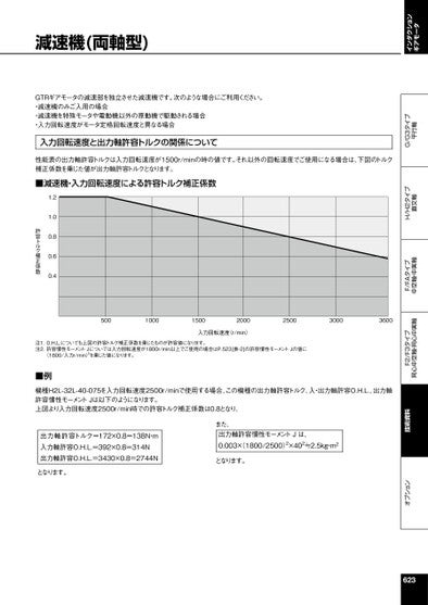 インダクションギアモータオプション技術資料F2/F3タイプ同心中空軸・同心中実軸F/FAタイプ中空軸・中実軸H/H2タイプ直交軸G/G3タイプ平行軸623減速機(両軸型)GTRギアモータの減速部を独立させた減速機です。次のような場合にご利用ください。・減速機のみご入用の場合・減速機を特殊モータや電動機以外の原動機で駆動される場合・入力回転速度がモータ定格回転速度と異なる場合入力回転速度と出力軸許容トルクの関係について性能表の出力軸許容トルクは入力回転速度が1500r/minの時の値です。それ以外の回転速度でご使用になる場合は、下図のトルク補正係数を乗じた値が出力軸許容トルクとなります。■減速機・入力回転速度による許容トルク補正係数1.21.00.80.60.4許容トルク補正係数500100015002000250030003600注1.O.H.L.についても上図の許容トルク補正係数を乗じたものが許容値になります。注2.許容慣性モーメントJについては入力回転速度が1800r/min以上でご使用の場合はP.523[表-2]の許容慣性モーメントJの値に(1800/入力r/min)2を乗じた値になります。入力回転速度(r/min)■例機種H2L-32L-40-075を入力回転速度2500r/minで使用する場合、この機種の出力軸許容トルク、入・出力軸許容O.H.L.、出力軸許容慣性モーメントJは以下のようになります。上図より入力回転速度2500r/min時での許容トルク補正係数は0.8となり、出力軸許容トルク=172×0.8=138N・m入力軸許容O.H.L.=392×0.8=314N出力軸許容O.H.L.=3430×0.8=2744Nとなります。また、出力軸許容慣性モーメントJは、0.003×(1800/2500)2×402≒2.5kg・m2となります。