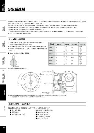 インダクションギアモータG/G3タイプ平行軸H/H2タイプ直交軸F/FAタイプ中空軸・中実軸F2/F3タイプ同心中空軸・同心中実軸技術資料オプションS型減速機GTRギアモータは自社製のモータを使用しております。それ以外のモータおよび特殊モータ(屋外モータ、安全増防爆モータなど)の取り付けを希望される場合には、このS型減速機をご利用ください。モータ取り付け部はJEM1401-1991一般用フランジ形低圧三相かご形誘導電動機の寸法であれば取り付け可能です。・S型減速機に取り付けるモータは、できるだけお客様にてご用意いただき、取り付けてくださいますようお願いいたします。・S型減速機に取り付けるモータは、モータメーカー色となります。・サーボモータなどのモータトルク特性が特殊なモータを使用される場合には、減速機の機種選定にご注意ください。サーボモータ用低バックラッシ減速機もご検討ください。モータ取り付け手順1.入力ピニオンにキーが正確にセットされているか確認する。(4Pモータ相当容量0.1kW~0.2kW)2.モータ軸の平取部または、キー溝にキー位置を合わせ挿入する。3.モータインロー部が完全に入ったことを確認し4本のボルトで締め付ける。●入力ピニオンキー溝寸法詳細W4Pモータ相当容量WT基準寸法寸法公差基準寸法寸法公差0.1kW0.2kW0.4kW0.75kW1.5kW2.2kW555688+0.05+0.01+0.05+0.01+0.05+0.01+0.05+0.01+0.05+0.01+0.05+0.0113131621.52731+0.10+0.10+0.20+0.20+0.20+0.20T注.P.640の注意事項を必ずお読みください。45°15°取り付けフランジⒶ標準位置Ⓑインロー入力ピニオン締付ボルト用タップ(4ヶ所)注.4Pモータ相当容量0.4kWの40・50枠の場合は締付ボルト用タップがのⒷ位置となりますので、ご注意ください。F3シリーズは除く)なお、S型減速機にモータを取り付ける際の注意事項はP.640をご参照ください。防爆形ギアモータのご案内S型減速機と特殊モータを組み合わせたギアモータもご用意しております。●安全増防爆形●耐圧防爆形●耐圧防爆形ブレーキ付詳細は下記をご参照ください。●G3タイプ・・P.196●H2タイプ・・P.314●F・FAタイプ・・・P.408●F3タイプ・・P.510624