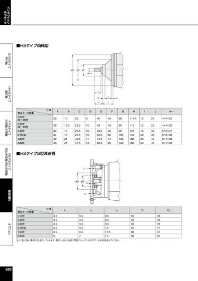 インダクションギアモータG/G3タイプ平行軸H/H2タイプ直交軸F/FAタイプ中空軸・中実軸F2/F3タイプ同心中空軸・同心中実軸技術資料オプション■H2タイプ両軸型φHφGφFφIh6JBACED相当モータ容量0.2kW22〜28枠0.2kW32〜40枠0.4kW0.75kW1.5kW2.2kW寸法ABCDEFGHIJキー282832374248102213.51017212625.526.525.542.541.581010101113404946.552.574.580.5434548627490808092105129130114.51151271421651651212152025302525303540454×4×224×4×225×5×276×6×328×7×358×7×40■H2タイプS型減速機L1φD1φD2L3L2相当モータ容量0.1kW0.2kW0.4kW0.75kW1.5kW2.2kW寸法L1L2L3D1D24.54.54.54.54.555.55.55.55.56.578.58.58.51012.513595959678896393939476270注1.各寸法は基準寸法を示しております。特にL2・D1・D2部は黒皮になっていますので、十分余裕をみてください。626