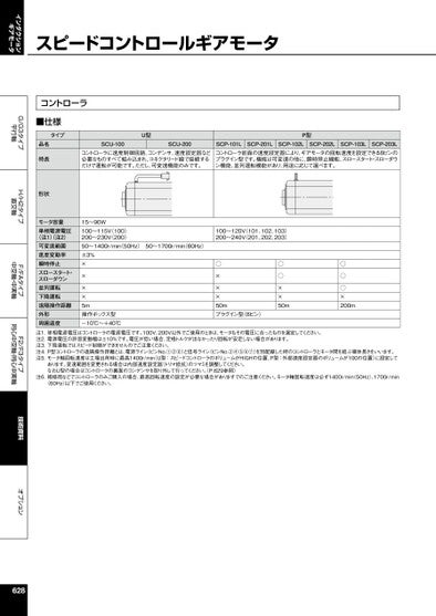 インダクションギアモータG/G3タイプ平行軸H/H2タイプ直交軸F/FAタイプ中空軸・中実軸F2/F3タイプ同心中空軸・同心中実軸技術資料オプションスピードコントロールギアモータコントローラ■仕様タイプU型P型品名特長形状モータ容量単相電源電圧(注1)(注2)可変速範囲速度変動率瞬時停止スロースタート・スローダウン並列運転下降運転遠隔操作距離外形周囲温度SCU-100SCU-200コントローラに速度制御回路、コンデンサ、速度設定器など必要なものすべて組み込まれ、コネクタリード線で接続するだけで運転が可能です。ただし、可変速機能のみです。SCP-102LSCP-202LSCP-201LSCP-203LSCP-101Lコントローラ前面の速度設定器により、ギアモータの回転速度を設定できる8ピンのプラグイン型です。機能は可変速の他に、瞬時停止機能、スロースタート・スローダウン機能、並列運転機能があり、用途に応じて選べます。SCP-103L15~90W100~115V(100)200~230V(200)50~1400r/min50Hz)50~1700r/min60Hz)±3%××××5m操作ボックス型-10℃~+40℃100~120V(101、102、103)200~240V(201、202、203)◯×××50mプラグイン型(8ピン)◯◯××50m◯◯◯×200m注1.単相電源電圧はコントローラの電源電圧です。100V、200V以外でご使用のときは、モータもその電圧に合ったものを選定してください。注2.電源電圧の許容変動幅は±10%です。電圧が低い場合、定格トルクが出なかったり回転が安定しない場合があります。注3.下降運転ではスピード制御ができませんのでご注意ください。注4.P型コントローラの遠隔操作距離とは、電源ライン(ピンNo.①②⑧)と信号ライン(ピンNo.③④⑤⑥⑦)を別配線した時のコントローラとモータ間を結ぶ導体長さをいいます。注5.モータ軸回転速度は工場出荷時に最高1400r/min(U型:スピードコントローラのボリュームがHIGHの位置、P型:外部速度設定器のボリュームが100の位置)に設定してあります。変速範囲を変更される場合は内部速度設定器(トリマ抵抗)のツマミを調整してください。なおU型の場合はコントローラの裏面のコンデンサを取り外して行ってください。P.629参照)注6.補修用などでコントローラのみご購入の場合、最高回転速度の設定が必要な場合がありますでのご注意ください。モータ軸回転速度は必ず1400r/min50Hz)、1700r/min(60Hz)以下でご使用ください。628