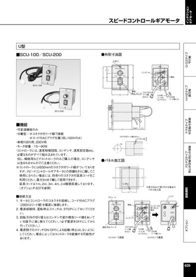 インダクションギアモータオプション技術資料F2/F3タイプ同心中空軸・同心中実軸F/FAタイプ中空軸・中実軸H/H2タイプ直交軸G/G3タイプ平行軸100V時コード付ACプラグ2m200V時リード線0.5mCW黒CSTOPVOLT200V~230VSCU-200NISEICORP.55運転・停止スイッチコネクタ付リード線600mm7228LOWHIGHRUN85橙色●外形寸法図2-φ4.321.5SPEEDCONTROLLERコンデンサCW茶12364Max4122コネクタ付リード線300mmCW●パネル加工図72±0.363+1.002-φ4.551+1.00ボリュームSPEEDCONTROLLER橙色※角穴をあけて取り付ける場合のパネル加工図トリマCW茶コンデンサを取り外した場合CW黒CコンデンサLOWHIHRUNSTOPVOL200V~230VSCU-200NISSECORP運転・停止スイッチコネクタ付リード線600mmコントローラ表面100V時コード付ACプラグ2m200V時リード線0.5mコントローラ裏面629U型■SCU-100/SCU-200SCU-100SCU-200■機能・可変速機能のみ・分離型/※コネクタ付リード線で接続※コード付ACプラグ付属(但し100Vのみ)・単相100V用、200V用・モータ容量/15~90W・コントローラには、速度制御回路、コンデンサ、速度設定器etc、必要なものがすべて組み込まれています。但し、補修用などでコントローラのみご購入の場合、コンデンサは含まれませんのでご注意ください。※コントローラには600mmのコネクタ付リード線がついておりますが、スピードコントロールギアモータとの距離をさらに離してご使用になりたい場合には、別売りのコネクタ付延長コードをご利用ください。最大5mまで離して使用できます。延長コードは1m、2m、3m、4m、と4種類用意しております。(オプションP.637を参照)■接続方法1.モータとコントローラのコネクタを接続し、コード付ACプラグ(200Vはリード線)を電源に接続します。2.電源接続時、運転停止スイッチは、STOPにしておいてください。3.回転方向の切り替えはコンデンサ部の橙色リード線をあいている端子に差し替えてください。(必ず電源をOFFにしてから行ってください。)4.電源側でのスイッチON/OFFによる起動・停止はしないようにしてください。場合によってはコントローラを破損する可能性があります。