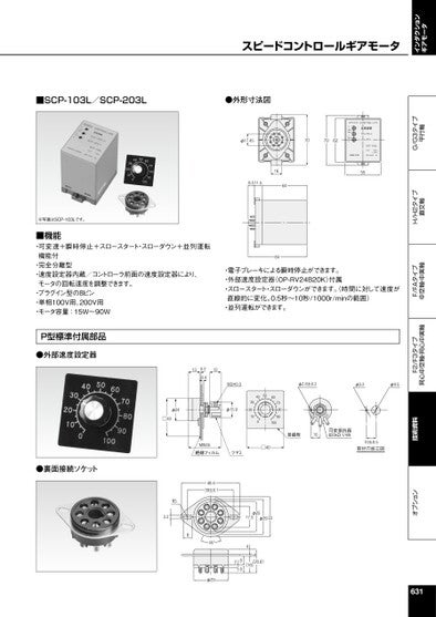 インダクションギアモータオプション技術資料F2/F3タイプ同心中空軸・同心中実軸F/FAタイプ中空軸・中実軸H/H2タイプ直交軸G/G3タイプ平行軸■SCP-103L/SCP-203L●外形寸法図φ17.4570706216648.511.5SPEEDCNOTROLLER0MAXMAX0MAX0速度調整スロースタートスローダウンSCP-203LLOVTV002V042~MAXAMP.A2NISEICORP.5584・電子ブレーキによる瞬時停止ができます。・外部速度設定器(OP-RV24B20K)付属・スロースタート・スローダウンができます。時間に対して速度が直線的に変化。0.5秒~10秒/1000r/minの範囲)・並列運転ができます。※写真はSCP-103Lです。■機能・可変速+瞬時停止+スロースタート・スローダウン+並列運転機能付・完全分離型・速度設定器内蔵/コントローラ前面の速度設定器により、モータの回転速度を調整できます。・プラグイン型の8ピン・単相100V用、200V用・モータ容量:15W~90WP型標準付属部品●外部速度設定器●裏面接続ソケットφ24□40R53.2130.20.412M3×0.5φ15.93020105040607080900100MIN35絶縁フィルムツマミ□40φ2.8±0.2φ3.2φ9.5①③目盛板10可変抵抗器B20kΩ1/4W10±0.5取付穴加工図48.439±0.1645°φ29φ2517.5φ293340.8(20.8)(16)288631