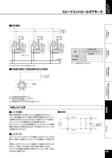 インダクションギアモータオプション技術資料F2/F3タイプ同心中空軸・同心中実軸F/FAタイプ中空軸・中実軸H/H2タイプ直交軸G/G3タイプ平行軸一方向運転・変速機能スロースタート・スローダウン並列運転モータ容量適用機種15~90WSCP-103LSCP-203L注1.一点鎖線は60W・90Wを示す。132外部速度設定器20kΩ1/4W(付属品)コンデンサギアモータ67451823単相100Vまたは単相200Vコンデンサギアモータ67451823コンデンサギアモータ67451823冷却用ファンモータ■並列運転0~4VDC1mA以上非接続67451823注1.端子5-6はいずれかの1台を短絡してください。■外部直流電圧で回転速度を変える場合注1.直流電源の極性を間違えないこと。注2.破線の接続は“結線図①~⑦”に基づく。但し⑥ピンは何も接続しないこと。注3.直流電源の出力は、必ず交流入力と絶縁してください。●接続図12結線上のご注意■ノイズ対策通常の使用条件では外来ノイズによる誤動作はありません。しかし、高圧機器の近くや大電力の開閉が頻繁な所では、モータの制御が不安定になることがあります。外部よりのノイズ対策としては、ノイズフィルタを接続すると大変効果があります。また、トライアックによる位相制御を行っているため、ラジオ雑音障害が発生する可能性があります。その場合にもノイズフィルタの接続をおすすめします。■コンデンサスピードコントロールギアモータの運転には必ずコンデンサが必要です。製品に付属されているコンデンサを結線してご使用ください。単相モータはすべてレバーシブル結線(リード線3本)がされておりますので、三相モータと同様に正転、逆転が容易にできます。コンデンサの容量は性能表をご参照ください。また、形状、寸法はP.544をご参照ください。4E3コントローラ電源端子635