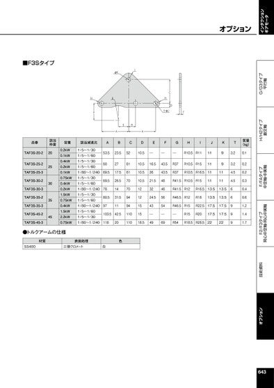 オプション技術資料F2/F3タイプ同心中空軸・同心中実軸F/FAタイプ中空軸・中実軸H/H2タイプ直交軸G/G3タイプ平行軸インダクションギアモータ■F3SタイプφKIGHFEBA品番該当枠番TAF3S-20-220TAF3S-25-2TAF3S-25-3TAF3S-30-2TAF3S-30-3TAF3S-35-2TAF3S-35-3TAF3S-45-2TAF3S-45-325303545容量該当減速比ABC0.2kW0.1kW0.4kW0.2kW0.1kW0.75kW0.4kW0.2kW1.5kW0.75kW0.4kW1.5kW2.2kW0.75kW1/5~1/301/5~1/601/5~1/301/5~1/601/80~1/2401/5~1/301/5~1/601/80~1/2401/5~1/301/5~1/601/80~1/2401/5~1/601/5~1/301/80~1/24053.523.56069.569.5782717.526.51480.531.5971152616170709494103.542.511820110110●トルクアームの仕様材質表面処理色SS400三価クロメート白10.510.510.51212151518.516.52621.53224.543―4948465654―69R41.5R12R16.513.513.5R46.5R12R1813.513.5R46.5R15R22.517.517.5―R15R2017.517.5R54R18.5R28.52222HCD3-φJTADEFGHIJKT質量(kg)10.5―――R10.5R111143.543.5R37R37R10.5R1511R10.5R16.511R41.5R10.5R15119911113.23.24.54.5669990.10.20.20.30.40.61.21.41.7643