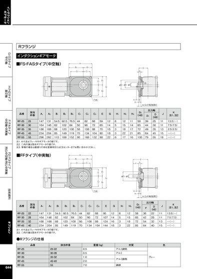 G/G3タイプ平行軸H/H2タイプ直交軸F/FAタイプ中空軸・中実軸F2/F3タイプ同心中空軸・同心中実軸技術資料オプションインダクションギアモータRフランジインダクションギアモータ■FS・FASタイプ(中空軸)A1B2C2B1C1B1C1C3B3A24-φJEGφD2φD1φDH3KH1H2(D2の有効深さ)品番RF-25RF-30RF-35RF-45RF-55該当枠番2530354555A1147164188234298A2B1B2B3C1C2C3EGH1H2H3D2(H8)出力軸D1D(H8)13114616820426254.562688511092.510212014918876.584100119152445056709082901081341686672881041325965708098121416182265336121518221711141721165865728510039444964792530354555J1111131518K注1、注213.5(―)7.5(7.5)2.5(2.5)――(―)(―)注1.K寸法はブレーキ付ギアモータの値です。注2.)内の値は防水ギアモータの値です。注3.単相の場合は最寄りの当社営業所またはCSセンターまでお問い合わせください。■FFタイプ(中実軸)A1B2C2B1C1φD2φDB1C1C3B3A24-φJA1A2B1B2B3C1C2C3EGH1H214716418823413114616820454.562688592.510212014976.584100119445056708290108134667288104951071241441214161865331215182258657285品番RF-25RF-30RF-35RF-45該当枠番22283240EGFKH1D2(H8)H2(D2の有効深さ)出力軸F36425464D(h6)22283240J11111315K注1、注213.5(―)7.5(7.5)――(―)(―)注1.K寸法はブレーキ付ギアモータの値です。注2.)内の値は防水ギアモータの値です。●Rフランジの仕様RF-25RF-30RF-35RF-45RF-55644品番該当枠番重量(kg)材質色25・2230・2835・3245・40550.50.51.02.07.0アルミ鋳物アルミアルミ鋳物鋳鉄グレー