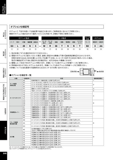G/G3タイプ平行軸H/H2タイプ直交軸F/FAタイプ中空軸・中実軸F2/F3タイプ同心中空軸・同心中実軸技術資料オプションインダクションギアモータブレーキ仕様オプションブレーキ補助記号仕様記号B2⑬X⑭AA⑮ターミナルボックスT⑫ギアヘッド型式モータ型式シリーズ取付枠番軸配置減速比モータ区分モータ仕様容量相数電源電圧規格G3①L②28③N④5⑤M⑥R⑦08⑧T⑨N⑩N⑪オプションで、下記の内容にて仕様変更や追加工を承ります。ご使用状況に合わせてご利用ください。複数のオプションを組み合わせて選択いただくことも可能です。詳細は下表をご参照ください。1.型式末尾に”X”と仕様記号を付けてご注文ください。2.複数のオプションをご指示いただいた場合、銘板に表記される順番は下表の【銘板表記順位】のとおりになります。【例】交流切りA[AA]、BOX位置(上)[TZ]、穴位置(下)[H6]、エンコーダ(100P/R)[X0]をご指示いただいた場合、型式の補助記号"X"の後に表記される仕様記号は、XOTZH6AAの順番になります。3.機種によって対応できるオプションが異なります。詳細については各オプションの詳細ページをご参照ください。4.同時組み合わせできないオプションもあります。詳細については各オプションの詳細ページをご参照ください。※詳細については当社最寄りの営業所またはCSセンターまでお問い合わせください。●オプション仕様記号一覧分類仕様記号反負荷側負荷側内容銘板表記順位オプション仕様記号モータ後部特殊仕様ターミナルボックス手動解放レバーブレーキ結線整流器内蔵出力軸X6X0X1X2X7CCT3T6T9TZH3H6HZR1R3R6R7R9RZABAADC40F2F3F4F5F6F7F8反負荷側のモータ軸を延長した状態で出荷します。エンコーダ(A/B/Z、100P/R、ラインドライバ)を付けて出荷します。エンコーダ(A/B/Z、1024P/R、ラインドライバ)を付けて出荷します。エンコーダ(A/B/Z、1024P/R、オープンコレクタ)を付けて出荷します。強制ファンを付けて出荷します。T型ターミナルボックス用のキャプコンを同梱して出荷します。ターミナルボックス位置をモータ反負荷側から見て(右)に変更します。ターミナルボックス位置をモータ反負荷側から見て(下)に変更します。ターミナルボックス位置をモータ反負荷側から見て(左)に変更します。ターミナルボックス位置をモータ反負荷側から見て(上)に変更します。ターミナルボックス穴の向きをモータ負荷側に変更します。ターミナルボックス穴の向きを(下)に変更します。注1)ターミナルボックス穴の向きを(上)に変更します。注1)手動解放用レバー位置をモータ反負荷側から見て(右下)に変更します。手動解放用レバー位置をモータ反負荷側から見て(右)に変更します。手動解放用レバー位置をモータ反負荷側から見て(下)に変更します。手動解放用レバー位置をモータ反負荷側から見て(左下)に変更します。手動解放用レバー位置をモータ反負荷側から見て(左)に変更します。手動解放用レバー位置をモータ反負荷側から見て(上)に変更します。ターミナルボックス内部に整流器を内蔵し、交流切りB用結線をした状態で出荷します。ターミナルボックス内部に整流器を内蔵し、交流切りA用結線をした状態で出荷します。ターミナルボックス内部に整流器を内蔵し、直流切り用結線をした状態で出荷します。出力軸を軸端タップ付に変更します。(G3タイプ標準仕様と防水の出力軸炭素鋼仕様は標準で軸端タップ付です)中空軸の出力軸内径をφ25からφ20に変更します。中空軸の出力軸内径をφ30からφ25に変更します。中空軸の出力軸内径をφ35からφ30に変更します。中空軸の出力軸内径をφ45からφ35に変更します。中空軸の出力軸内径をφ45からφ40に変更します。中空軸の出力軸内径をφ55からφ45に変更します。中空軸の出力軸内径をφ55からφ50に変更します。注1.ターミナルボックス位置がどこにあっても穴位置は必ず負荷側が「3」反負荷側が「9」となります。注2.トルクアームや保護素子など、オプションパーツには仕様記号はありません。646123456789