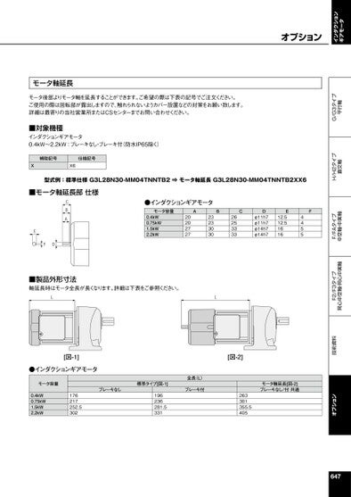 オプション技術資料F2/F3タイプ同心中空軸・同心中実軸F/FAタイプ中空軸・中実軸H/H2タイプ直交軸G/G3タイプ平行軸インダクションギアモータモータ軸延長モータ後部よりモータ軸を延長することができます。ご希望の際は下表の記号でご注文ください。ご使用の際は回転部が露出しますので、触れられないようカバー設置などの対策をお願い致します。詳細は最寄りの当社営業所またはCSセンターまでお問い合わせください。■対象機種インダクションギアモータ0.4kW~2.2kW:ブレーキなし・ブレーキ付(防水IP65除く)補助記号仕様記号XX6型式例:標準仕様G3L28N30-MM04TNNTB2⇒モータ軸延長G3L28N30-MM04TNNTB2XX6■モータ軸延長部仕様CBAEFD●インダクションギアモータモータ容量0.4kW0.75kW1.5kW2.2kWA20202727B23233030C26253333Dφ11h7φ11h7φ14h7φ14h7E12.512.51616F4455■製品外形寸法軸延長時はモータ全長が長くなります。詳細は下表をご参照ください。LL[図-1]●インダクションギアモータモータ容量0.4kW0.75kW1.5kW2.2kW176217252.5302全長(L)ブレーキ付ブレーキなし標準タイプ[図-1]196236281.5331[図-2]263301355.5405モータ軸延長[図-2]ブレーキなし/付共通647