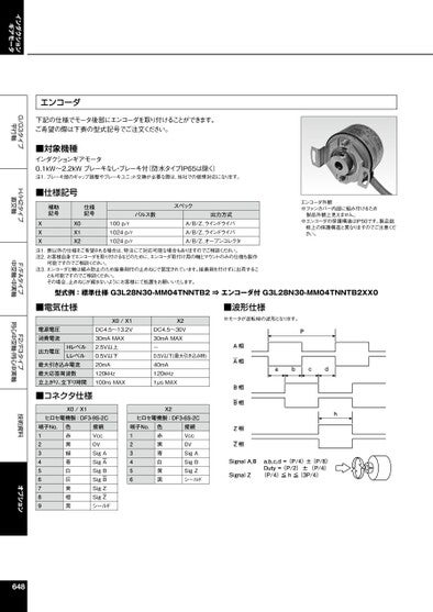 G/G3タイプ平行軸H/H2タイプ直交軸F/FAタイプ中空軸・中実軸F2/F3タイプ同心中空軸・同心中実軸技術資料オプションインダクションギアモータエンコーダ下記の仕様でモータ後部にエンコーダを取り付けることができます。ご希望の際は下表の型式記号でご注文ください。■対象機種インダクションギアモータ0.1kW~2.2kWブレーキなし・ブレーキ付(防水タイプIP65は除く)注1.ブレーキ部のギャップ調整やブレーキユニット交換が必要な際は、当社での修理対応になります。■仕様記号補助記号仕様記号XXXX0X1X2100p/r1024p/r1024p/rパルス数スペック出力方式A/B/Z、ラインドライバA/B/Z、ラインドライバA/B/Z、オープンコレクタエンコーダ外観※ファンカバー内部に組み付けるため製品外観上見えません。※エンコーダの保護構造はIP50です。製品銘板上の保護構造と異なりますのでご注意ください。注1.表以外の仕様をご希望される場合は、特注にて対応可能な場合もありますのでご相談ください。注2.お客様自身でエンコーダを取り付けるなどのために、エンコーダ取付け用の軸とマウントのみの仕様も製作可能ですのでご相談ください。注3.エンコーダと軸は緩み防止のため接着剤付の止めねじで固定されています。接着剤を付けずに出荷することも可能ですのでご相談ください。その場合、止めねじが緩まないようにお客様にて処置をお願いいたします。型式例:標準仕様G3L28N30-MM04TNNTB2⇒エンコーダ付G3L28N30-MM04TNNTB2XX0■電気仕様電源電圧消費電流出力電圧HレベルLレベル最大引き込み電流最大応答周波数立上がり、立下り時間■コネクタ仕様X0/X1X0/X1DC4.5~13.2V30mAMAX2.5V以上0.5V以下20mA120kHz100nsMAXX2DC4.5~30V30mAMAX-0.5V以下(最大引き込み時)40mA120kHz1μsMAXX2ヒロセ電機製:DF3-9S-2Cヒロセ電機製:DF3-6S-2C端子No.123456789色赤黒緑青白灰黄橙黒接続Vcc0VSigASigASigBSigBSigZSigZシールド端子No.123456色赤黒青白黄黒接続Vcc0VSigASigBSigZシールド■波形仕様※モータが逆転時の波形となります。PA相A相B相B相Z相Z相abcdhSignalA,BSignalZa,b,c,d=(P/4)±(P/8)Duty=(P/2)±(P/4)(P/4)≦h≦(3P/4)648