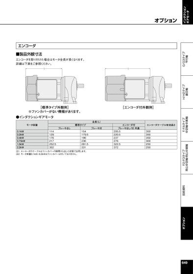 オプション技術資料F2/F3タイプ同心中空軸・同心中実軸F/FAタイプ中空軸・中実軸H/H2タイプ直交軸G/G3タイプ平行軸インダクションギアモータエンコーダ■製品外観寸法エンコーダを取り付けた場合はモータ全長が長くなります。詳細は下表をご参照ください。LL[標準タイプ外観例]※ファンカバーがない機種があります。●インダクションギアモータモータ容量0.1kW0.2kW0.4kW0.75kW1.5kW2.2kW114129176217252.5302ブレーキなし全長(L)ブレーキ付標準タイプ154179.5196236281.5331注1.エンコーダのケーブルはファンカバーの隙間から出した状態で出荷します。注2.モータ容量0.1kW、0.2kWはファンカバーは付いておりません。[エンコーダ付外観例]エンコーダ付ブレーキなし/付共通205.5220.5237276322.5372エンコーダケーブル有効長さ350350350300250250649