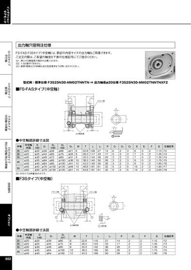 G/G3タイプ平行軸H/H2タイプ直交軸F/FAタイプ中空軸・中実軸F2/F3タイプ同心中空軸・同心中実軸技術資料オプションインダクションギアモータ型式例:標準仕様F3S25N30-MM02TNNTN⇒出力軸径φ20仕様F3S25N30-MM02TNNTNXF2■FS・FASタイプ(中空軸)D3D2DD1TL1PGフランジ面WLD4L1PG1EEC2C3C3C1止め輪用溝F30°部詳細●中空軸部詳細寸法図出力軸穴径特注仕様FS・FAS・F3Sタイプ(中空軸)は、表記の内径サイズの出力軸もご用意できます。ご注文の際は、ご希望の軸径を下表の仕様記号にてご指示ください。注1.挿入する軸強度の検討が必要になります。注2.1/5は製作できません。注3.納期・価格などの詳細は当社各営業所までお問い合わせください。DD1中空軸内径枠番25303545(H8)φ20φ25φ30φ35φ40φ45φ50φ20φ25φ30φ35φ40φ45φ50φ39φ44φ49φ64φ64φ79φ79注1.FAタイプは枠番55のみです。55D2(H8)φ58φ65φ72φ85φ85φ100φ100D3(h8)φ66φ75φ85φ100φ100φ120φ120D4φ21φ26φ31φ36φ41φ46φ51WT6881012141422.828.333.338.343.348.853.8L108117124140140181181■F3Sタイプ(中空軸)LL1PGフランジ面L1PGフランジ面L1PC1C2C3EE1FG仕様記号22222223333355677661010000002222222221.151.351.351.751.951.952.20F2F3F4F5F6F7F827333850506161141720262632326533355WD2DD1EC1●中空軸部詳細寸法図中空軸内径φ20φ25φ30φ35φ40枠番25303545652D(H8)φ20φ25φ30φ35φ40D1φ39φ44φ49φ64φ64D2(h7)φ66φ75φ85φ100φ100TD2DD1EC130°FE部詳細LL1PC1FG仕様記号1181241421681682733385050141720262622222222221.151.351.351.751.95F2F3F4F5F6止め輪用溝W6881012T22.828.333.338.343.3