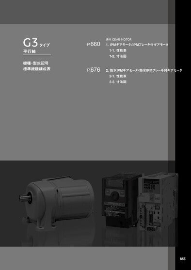 G3タイプ平行軸機種・型式記号標準機種構成表P.660P.676IPMGEARMOTOR1.IPMギアモータ/IPMブレーキ付ギアモータ1-1.性能表1-2.寸法図2.防水IPMギアモータ/防水IPMブレーキ付ギアモータ2-1.性能表2-2.寸法図655