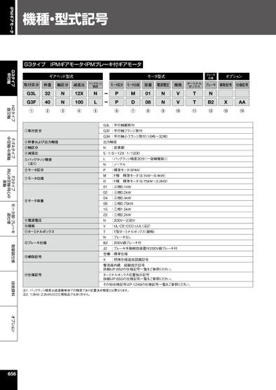 IPMギアモータG3タイプ平行軸H2タイプ直交軸F/FAタイプ中空軸・中実軸F3タイプ同心中空軸・同心中実軸モータ部・ブレーキ部仕様制御部仕様技術資料オプション機種・型式記号G3タイプIPMギアモータ・IPMブレーキ付ギアモータギアヘッド型式モータ型式ブレーキ仕様オプション取付区分枠番軸区分減速比バックラッシ精度モータ区分モータ仕様容量電源電圧規格ターミナルボックスブレーキ補助記号仕様記号G3LG3F①3240②NN③12X100④NL⑤PP⑥MD⑦0108⑧NN⑨VV⑩TT⑪NB2⑫X⑬AA⑭①取付区分②枠番および出力軸径③軸区分④減速比⑤バックラッシ精度(注1)⑥モータ区分⑦モータ仕様⑧モータ容量⑨電源電圧⑩規格⑪ターミナルボックス⑫ブレーキ仕様⑬補助記号⑭仕様記号G3L:平行軸脚取付G3F:平行軸フランジ取付G3K:平行軸小フランジ取付(18枠〜32枠)出力軸径N5:1/5〜12X:1/1200LNPMD010204081522NVTNB2J2空欄:標準仕様X整流器内蔵結線指示記号詳細はP.852の仕様記号一覧をご参照ください。ターミナルボックス位置指示記号詳細はP.855の仕様記号一覧をご参照ください。その他仕様記号はP.1249の仕様記号一覧をご参照ください。:バックラッシ精度30分(一部機種除く):ノーマル:標準モータ(IP44):F種標準モータ(0.1kW〜0.4kW):F種標準モータ(0.75kW〜2.2kW):三相0.1kW:三相0.2kW:三相0.4kW:三相0.75kW:三相1.5kW:三相2.2kW:200V〜230V:UL・CE・CCC・cUL注2):T型ターミナルボックス(鋼板):ブレーキなし:200V級ブレーキ付:ブレーキ手動解放装置付200V級ブレーキ付:炭素鋼:特殊仕様追加認識記号注1.バックラッシ精度は減速機単体での精度であり位置決め精度とは異なります。注2.1.5kW、2.2kWはCCC規格品ではありません。656