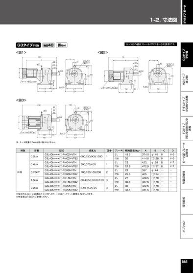 1-2.⼨法図IPMギアモータオプション技術資料制御部仕様モータ部・ブレーキ部仕様F3タイプ同心中空軸・同心中実軸F/FAタイプ中空軸・中実軸H2タイプ直交軸G3タイプ平行軸G3タイプ平行軸軸径40脚取付カッコ()の値はブレーキ付ギアモータの表示です。<図1><図2>(A)A34150196686560209012843M10xP1.5深さ25φ40h6122301504-φ15210254Bケーブル引込口φ27(A)Aφ20686560D43BCφ40h612M10xP1.5深さ2536266230150ケーブル引込口φ27<図3>(A)ABケーブル引込口φ2720906865602090150196φ20341501964-φ1521025413943M10xP1.5深さ2536φ40h6122662301504-φ15210254注.モータ容量0.2kWは吊り板はありません。相数容量型式減速比図番0.2kW0.4kW三相0.75kW1.5kW2.2kWG3L40N***□-PM02NVTNG3L40N***□-PM02NVTB2G3L40N***□-PM04NVTNG3L40N***□-PM04NVTB2G3L40N***□-PD08NVTNG3L40N***□-PD08NVTB2G3L40N***□-PD15NVTNG3L40N***□-PD15NVTB2G3L40N***□-PD22NVTNG3L40N***□-PD22NVTB2600,750,900,1200300,375,450100,120,160,20030,40,50,60,80,1005,10,15,20,2511233※型式の***には減速比が入ります。また、□にはバックラッシ精度(L,N)が入ります。※性能表はP.660をご参照ください。ブレーキなし付きなし付きなし付きなし付きなし付き概略質量(kg)18.5202223.52325.52730.53033.5A374.5414.5422472.5357405438.5467.5422.5451.5Bφ115□126φ128□137φ144□154□178□178□178□178C0088──────D110110117117──────665
