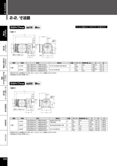 G3タイプ平行軸H2タイプ直交軸F/FAタイプ中空軸・中実軸F3タイプ同心中空軸・同心中実軸モータ部・ブレーキ部仕様制御部仕様技術資料オプションIPMギアモータ2-2.⼨法図G3タイプ平行軸軸径18脚取付<図1>(A)A323027108.220.5B適合コード径φ8~φ1216.5φ18h66104540644-φ9110134M6xP1.0深さ1513185カッコ()の値はブレーキ付ギアモータの表示です。相数容量三相0.1kW0.2kW型式G3L18N***□-VM01NVENG3L18N***□-VM01NVEV2G3L18N***□-VM02NVENG3L18N***□-VM02NVEV2減速比図番5,10,15,20,25,30,40,505,10,15,20,2511ブレーキなし付きなし付き概略質量(kg)5.5756.5A253.5281253.5281Bφ115φ115φ115φ115※型式の***には減速比が入ります。また、□にはバックラッシ精度(L,N)が入ります。※性能表はP.676をご参照ください。G3タイプ平行軸軸径22脚取付<図2>(A)AB適合コード径φ8~φ12φ22h64240351255196590C624.5M8xP1.25深さ20139904-φ11130154相数容量三相0.1kW0.2kW0.4kW型式G3L22N***□-VM01NVENG3L22N***□-VM01NVEV2G3L22N***□-VM02NVENG3L22N***□-VM02NVEV2G3L22N***□-VM04NVENG3L22N***□-VM04NVEV2減速比60,80,100,120,160,20030,40,50,60,80,1005,10,15,20,25図番222ブレーキなし付きなし付きなし付き概略質量(kg)6.5867.58.510A279.5307279.5307311.5336.5Bφ115φ115φ115φ115φ128φ128C108.2108.2108.2108.2115.2115.2※型式の***には減速比が入ります。また、□にはバックラッシ精度(L,N)が入ります。※性能表はP.676をご参照ください。678