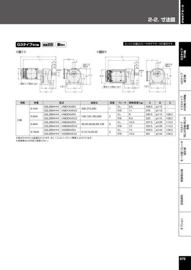 2-2.⼨法図オプション技術資料制御部仕様モータ部・ブレーキ部仕様F3タイプ同心中空軸・同心中実軸F/FAタイプ中空軸・中実軸H2タイプ直交軸G3タイプ平行軸IPMギアモータG3タイプ平行軸軸径28脚取付カッコ()の値はブレーキ付ギアモータの表示です。<図1>(A)AB適合コード径φ8~φ124745401565490125<図2>(A)A108.231M8xP1.25深さ20φ28h68171.5167φ1441104-φ11140175適合コード径φ8~φ12C8φ28h647454015654-φ1123.590125相数容量型式減速比図番三相0.1kW0.2kW0.4kW0.75kWG3L28N***□-VM01NVENG3L28N***□-VM01NVEV2G3L28N***□-VM02NVENG3L28N***□-VM02NVEV2G3L28N***□-VM04NVENG3L28N***□-VM04NVEV2G3L28N***□-VD08NVENG3L28N***□-VD08NVEV2300,375,450100,120,160,20030,40,50,60,80,1005,10,15,20,251222ブレーキなし付きなし付きなし付きなし付き概略質量(kg)9.51189.510.5121315.5A348.5376292.5320327.5352.5329.5361※型式の***には減速比が入ります。また、□にはバックラッシ精度(L,N)が入ります。※性能表はP.676をご参照ください。31M8xP1.25深さ20167110140175Bφ115φ115φ115φ115φ128φ128φ144φ144C──108.2108.2115.2115.2126.2126.2679