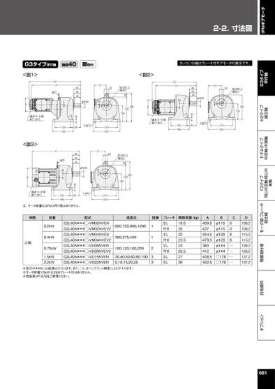 2-2.⼨法図オプション技術資料制御部仕様モータ部・ブレーキ部仕様F3タイプ同心中空軸・同心中実軸F/FAタイプ中空軸・中実軸H2タイプ直交軸G3タイプ平行軸IPMギアモータG3タイプ平行軸軸径40脚取付カッコ()の値はブレーキ付ギアモータの表示です。<図1><図2>(A)A341501966865602090D12φ40h643M10xP1.5深さ252301504-φ15210254(A)Aφ20686560D43M10xP1.5深さ2536Cφ40h612266230150B適合コード径φ8~φ124-φ15210254D12φ40h643M10xP1.5深さ25362662301504-φ1521025420906865602090150196φ2034150196B適合コード径φ8~φ12<図3>AB適合コード径φ8~φ12注.モータ容量0.2kWは吊り板はありません。相数容量型式減速比図番三相0.2kW0.4kW0.75kW1.5kW2.2kWG3L40N***□-VM02NVENG3L40N***□-VM02NVEV2G3L40N***□-VM04NVENG3L40N***□-VM04NVEV2G3L40N***□-VD08NVENG3L40N***□-VD08NVEV2G3L40N***□-VD15NVENG3L40N***□-VD22NVEN600,750,900,1200300,375,450100,120,160,20030,40,50,60,80,1005,10,15,20,2511233ブレーキなし付きなし付きなし付きなしなし概略質量(kg)18.5202223.52325.52730A409.5437454.5479.5380412438.5422.5Bφ115φ115φ128φ128φ144φ144□178□178C0088────D108.2108.2115.2115.2126.2126.2137.2137.2※型式の***には減速比が入ります。また、□にはバックラッシ精度(L,N)が入ります。※モータ容量1.5kW・2.2kWブレーキ付はありません。※性能表はP.676をご参照ください。681
