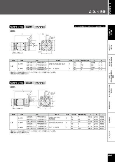 2-2.⼨法図オプション技術資料制御部仕様モータ部・ブレーキ部仕様F3タイプ同心中空軸・同心中実軸F/FAタイプ中空軸・中実軸H2タイプ直交軸G3タイプ平行軸IPMギアモータG3タイプ平行軸軸径18フランジ取付カッコ()の値はブレーキ付ギアモータの表示です。<図1>B(A)A3531016.53027φ18h6φ145h7108.2620.5071.D.C.M6xP1.0深さ157780157適合コード径φ8~φ124-φ11154相数容量型式減速比図番三相0.1kW0.2kWG3F18N***□-VM01NVENG3F18N***□-VM01NVEV2G3F18N***□-VM02NVENG3F18N***□-VM02NVEV25,10,15,20,25,30,40,505,10,15,20,2511ブレーキなし付きなし付き概略質量(kg)67.55.57A253.5281253.5281Bφ115φ115φ115φ115※型式の***には減速比が入ります。また、□にはバックラッシ精度(L,N)が入ります。※性能表はP.676をご参照ください。G3タイプ平行軸軸径22フランジ取付<図2>(A)AB47440351219φ22h6φ148h7C624.5581.D.C.PM8xP1.25深さ2082.5171.589適合コード径φ8~φ124-φ11164相数容量型式減速比図番0.1kW三相0.2kW0.4kWG3F22N***□-VM01NVENG3F22N***□-VM01NVEV2G3F22N***□-VM02NVENG3F22N***□-VM02NVEV2G3F22N***□-VM04NVENG3F22N***□-VM04NVEV260,80,100,120,160,20030,40,50,60,80,1005,10,15,20,25222ブレーキなし付きなし付きなし付き概略質量(kg)78.56.58910.5A292.5307279.5307311.5336.5Bφ115φ115φ115φ115φ128φ128C108.2108.2108.2108.2115.2115.2※型式の***には減速比が入ります。また、□にはバックラッシ精度(L,N)が入ります。※性能表はP.676をご参照ください。683