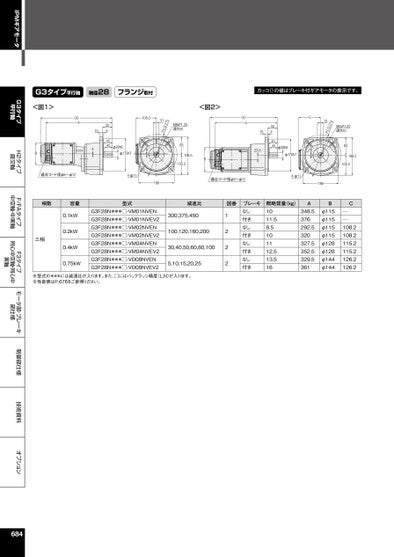 G3タイプ平行軸H2タイプ直交軸F/FAタイプ中空軸・中実軸F3タイプ同心中空軸・同心中実軸モータ部・ブレーキ部仕様制御部仕様技術資料オプションIPMギアモータG3タイプ平行軸軸径28フランジ取付カッコ()の値はブレーキ付ギアモータの表示です。M8xP1.25深さ2093198.5105.5215.31D.C.<図2>M8xP1.25深さ2093198.5105.5B(A)A50445401523.5φ28h6φ170h7C8215.D.C.108.231φ28h6φ170h780454540154(A)A<図1>B適合コード径φ8~φ124-φ11186適合コード径φ8~φ124-φ11186相数容量型式減速比図番三相0.1kW0.2kW0.4kW0.75kWG3F28N***□-VM01NVENG3F28N***□-VM01NVEV2G3F28N***□-VM02NVENG3F28N***□-VM02NVEV2G3F28N***□-VM04NVENG3F28N***□-VM04NVEV2G3F28N***□-VD08NVENG3F28N***□-VD08NVEV2300,375,450100,120,160,20030,40,50,60,80,1005,10,15,20,251222ブレーキなし付きなし付きなし付きなし付き概略質量(kg)1011.58.5101112.513.516A348.5376292.5320327.5352.5329.5361Bφ115φ115φ115φ115φ128φ128φ144φ144C──108.2108.2115.2115.2126.2126.2※型式の***には減速比が入ります。また、□にはバックラッシ精度(L,N)が入ります。※性能表はP.676をご参照ください。684