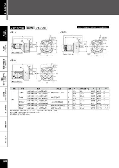 G3タイプ平行軸H2タイプ直交軸F/FAタイプ中空軸・中実軸F3タイプ同心中空軸・同心中実軸モータ部・ブレーキ部仕様制御部仕様技術資料オプションIPMギアモータブレーキなし付きなし付きなし付きなしなし概略質量(kg)2021.523.52524.52728.531.5A409.5437454.5479.5380.5412438.5422.5Bφ115φ115φ128φ128φ144φ144□178□178C0088──137.2147.2M10xP1.5深さ25135149284310.D.C.P<図2>M10xP1.5深さ25135149284B(A)A1856560φ40h6φ230h734適合コード径φ8~φ124-φ181243270310.D.C.PG3タイプ平行軸軸径40フランジ取付カッコ()の値はブレーキ付ギアモータの表示です。<図1>B(A)Aφ20185C6560φ40h6φ230h7適合コード径φ8~φ124-φ18<図3>Aφ201856560φ40h6φ230h734B適合コード径φ8~φ12相数容量4-φ18型式12C124327043270013.D.C.M10xP1.5深さ25135149284減速比図番三相0.2kW0.4kW0.75kW1.5kW2.2kWG3F40N***□-VM02NVENG3F40N***□-VM02NVEV2G3F40N***□-VM04NVENG3F40N***□-VM04NVEV2G3F40N***□-VD08NVENG3F40N***□-VD08NVEV2G3F40N***□-VD15NVENG3F40N***□-VD22NVEN600,750,900,1200300,375,450100,120,160,20030,40,50,60,80,1005,10,15,20,2511233※型式の***には減速比が入ります。また、□にはバックラッシ精度(L,N)が入ります。※モータ容量1.5kW・2.2kWブレーキ付はありません。※性能表はP.676をご参照ください。686