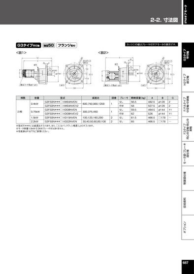 2-2.⼨法図オプション技術資料制御部仕様モータ部・ブレーキ部仕様F3タイプ同心中空軸・同心中実軸F/FAタイプ中空軸・中実軸H2タイプ直交軸G3タイプ平行軸IPMギアモータ適合コード径φ8~φ12相数容量0.4kW三相0.75kW1.5kW2.2kW減速比図番G3F50N***□-VM04NVENG3F50N***□-VM04NVEV2G3F50N***□-VD08NVENG3F50N***□-VD08NVEV2G3F50N***□-VD15NVENG3F50N***□-VD22NVEN600,750,900,1200300,375,450100,120,160,20030,40,50,60,80,1001122※型式の***には減速比が入ります。また、□にはバックラッシ精度(L,N)が入ります。※モータ容量1.5kW・2.2kWブレーキ付はありません。※性能表はP.677をご参照ください。G3タイプ平行軸軸径50フランジ取付カッコ()の値はブレーキ付ギアモータの表示です。<図1><図2>(A)Aφ20255BC7570φ50h6φ270h714063.D.C.PM12xP1.75深さ30150323.5B53.5173.5A25φ20408357570φ50h6φ270h714063.D.C.PM12xP1.75深さ30150323.553.5173.53004-φ22型式適合コード径φ8~φ124-φ22300ブレーキなし付きなし付きなしなし概略質量(kg)56.55859.56261.565A482.5507.5494.5526466.5466.5Bφ128φ128φ144φ144□178□178C221111──687