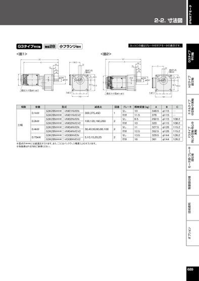 2-2.⼨法図オプション技術資料制御部仕様モータ部・ブレーキ部仕様F3タイプ同心中空軸・同心中実軸F/FAタイプ中空軸・中実軸H2タイプ直交軸G3タイプ平行軸IPMギアモータG3タイプ平行軸軸径28小フランジ取付カッコ()の値はブレーキ付ギアモータの表示です。<図1>(A)AB適合コード径φ8~φ125254540154108.231φ28h6φ80h78<図2>(A)AM8xP1.25深さ2047.558.594.5105.5B52545401523.5φ28h6φ80h7C831M8xP1.25深さ2058.547.594.5105.54-φ117171164適合コード径φ8~φ124-φ117171164相数容量型式減速比図番三相0.1kW0.2kW0.4kW0.75kWG3K28N***□-VM01NVENG3K28N***□-VM01NVEV2G3K28N***□-VM02NVENG3K28N***□-VM02NVEV2G3K28N***□-VM04NVENG3K28N***□-VM04NVEV2G3K28N***□-VD08NVENG3K28N***□-VD08NVEV2300,375,450100,120,160,20030,40,50,60,80,1005,10,15,20,251222ブレーキなし付きなし付きなし付きなし付き概略質量(kg)1011.58.5101112.513.516A348.5376292.5320327.5352.5329.5361Bφ115φ115φ115φ115φ128φ128φ144φ144C──108.2108.2115.2115.2126.2126.2※型式の***には減速比が入ります。また、□にはバックラッシ精度(L,N)が入ります。※性能表はP.676をご参照ください。689