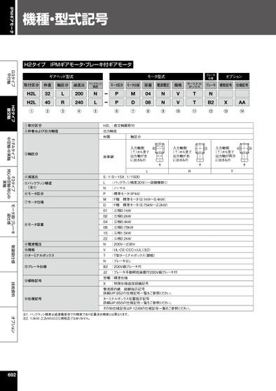 IPMギアモータG3タイプ平行軸H2タイプ直交軸F/FAタイプ中空軸・中実軸F3タイプ同心中空軸・同心中実軸モータ部・ブレーキ部仕様制御部仕様技術資料オプション機種・型式記号H2タイプIPMギアモータ・ブレーキ付ギアモータギアヘッド型式モータ型式ブレーキ仕様オプション取付区分枠番軸区分減速比バックラッシ精度モータ区分モータ仕様容量電源電圧規格ターミナルボックスブレーキ補助記号仕様記号H2LH2L①3240②LR③200240④NL⑤PP⑥MD⑦0408⑧NN⑨VV⑩TT⑪NB2⑫X⑬AA⑭①取付区分②枠番および出力軸径H2L:直交軸脚取付出力軸径材質軸区分③軸区分炭素鋼入力軸側(↑)から見て出力軸が左に出るものギアヘッドモータ入力軸側(↑)から見て出力軸が右に出るもの入力軸側(↑)から見て出力軸が両方に出るもの④減速比⑤バックラッシ精度(注1)⑥モータ区分⑦モータ仕様⑧モータ容量⑨電源電圧⑩規格⑪ターミナルボックス⑫ブレーキ仕様⑬補助記号⑭仕様記号LRT:バックラッシ精度30分(一部機種除く):ノーマル:標準モータ(IP44):F種標準モータ(0.1kW〜0.4kW):F種標準モータ(0.75kW〜2.2kW):三相0.1kW:三相0.2kW:三相0.4kW:三相0.75kW:三相1.5kW:三相2.2kW:200V〜230V:UL・CE・CCC・cUL注2):T型ターミナルボックス(鋼板):ブレーキなし:200V級ブレーキ付:ブレーキ手動解放装置付200V級ブレーキ付5:1/5〜15X:1/1500LNPMD010204081522NVTNB2J2空欄:標準仕様X整流器内蔵結線指示記号詳細はP.852の仕様記号一覧をご参照ください。ターミナルボックス位置指示記号詳細はP.855の仕様記号一覧をご参照ください。その他仕様記号はP.1249の仕様記号一覧をご参照ください。:特殊仕様追加認識記号注1.バックラッシ精度は減速機単体での精度であり位置決め精度とは異なります。注2.1.5kW、2.2kWはCCC規格品ではありません。692
