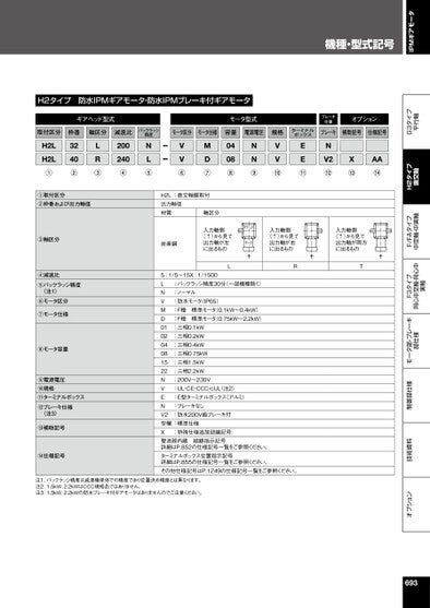 機種・型式記号IPMギアモータオプション技術資料制御部仕様モータ部・ブレーキ部仕様F3タイプ同心中空軸・同心中実軸F/FAタイプ中空軸・中実軸H2タイプ直交軸G3タイプ平行軸H2タイプ防水IPMギアモータ・防水IPMブレーキ付ギアモータギアヘッド型式モータ型式ブレーキ仕様オプション取付区分枠番軸区分減速比バックラッシ精度モータ区分モータ仕様容量電源電圧規格ターミナルボックスブレーキ補助記号仕様記号H2LH2L①3240②LR③200240④NL⑤VV⑥MD⑦0408⑧NN⑨VV⑩EE⑪NV2⑫X⑬AA⑭①取付区分②枠番および出力軸径H2L:直交軸脚取付出力軸径材質軸区分③軸区分炭素鋼入力軸側(↑)から見て出力軸が左に出るものギアヘッドモータ入力軸側(↑)から見て出力軸が右に出るもの入力軸側(↑)から見て出力軸が両方に出るもの④減速比⑤バックラッシ精度(注1)⑥モータ区分⑦モータ仕様⑧モータ容量⑨電源電圧⑩規格⑪ターミナルボックス⑫ブレーキ仕様(注3)⑬補助記号⑭仕様記号LRT:バックラッシ精度30分(一部機種除く):ノーマル:防水モータ(IP65):F種標準モータ(0.1kW〜0.4kW):F種標準モータ(0.75kW〜2.2kW):三相0.1kW:三相0.2kW:三相0.4kW:三相0.75kW:三相1.5kW:三相2.2kW:200V〜230V:UL・CE・CCC・cUL注2):E型ターミナルボックス(アルミ):ブレーキなし:防水200V級ブレーキ付5:1/5〜15X:1/1500LNVMD010204081522NVENV2空欄:標準仕様X整流器内蔵結線指示記号詳細はP.852の仕様記号一覧をご参照ください。ターミナルボックス位置指示記号詳細はP.855の仕様記号一覧をご参照ください。その他仕様記号はP.1249の仕様記号一覧をご参照ください。:特殊仕様追加認識記号注1.バックラッシ精度は減速機単体での精度であり位置決め精度とは異なります。注2.1.5kW、2.2kWはCCC規格品ではありません。注3.1.5kW、2.2kWの防水ブレーキ付ギアモータはありませんのでご注意ください。693