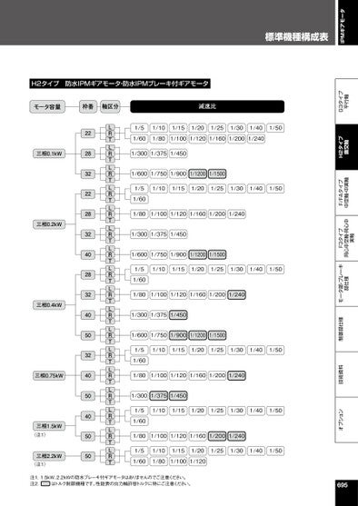 標準機種構成表IPMギアモータオプション技術資料制御部仕様モータ部・ブレーキ部仕様F3タイプ同心中空軸・同心中実軸F/FAタイプ中空軸・中実軸H2タイプ直交軸G3タイプ平行軸1/51/101/151/201/251/301/401/501/601/801/1001/1201/1601/2001/2401/3001/3751/4501/6001/7501/9001/12001/15001/51/101/151/201/251/301/401/501/601/801/1001/1201/1601/2001/2401/3001/3751/4501/6001/7501/9001/12001/15001/51/101/151/201/251/301/401/501/601/801/1001/1201/1601/2001/2401/3001/3751/4501/6001/7501/9001/12001/15001/51/101/151/201/251/301/401/501/601/801/1001/1201/1601/2001/2401/3001/3751/4501/51/101/151/201/251/301/401/501/601/801/1001/1201/1601/2001/2401/51/101/151/201/251/301/401/501/601/801/1001/120LRTLRTLRTLRTLRTLRTLRTLRTLRTLRTLRTLRTLRTLRTLRTLRTLRT2228322228324028324050324050405050三相0.1kW三相0.2kW三相0.4kW三相0.75kW三相1.5kW(注1)三相2.2kW(注1)H2タイプ防水IPMギアモータ・防水IPMブレーキ付ギアモータモータ容量枠番軸区分減速比注1.1.5kW、2.2kWの防水ブレーキ付ギアモータはありませんのでご注意ください。注2.はトルク制限機種です。性能表の出力軸許容トルクに特にご注意ください。695