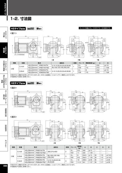 IPMギアモータG3タイプ平行軸H2タイプ直交軸F/FAタイプ中空軸・中実軸F3タイプ同心中空軸・同心中実軸モータ部・ブレーキ部仕様制御部仕様技術資料オプション1-2.⼨法図H2タイプ直交軸軸径22脚取付<図1>(A)A24.5110B30.5ケーブル引込口φ2770106相数容量61504-φ11型式三相0.1kW0.2kWH2L22#***□-PM01NVTNH2L22#***□-PM01NVTB2H2L22#***□-PM02NVTNH2L22#***□-PM02NVTB2カッコ()の値はブレーキ付ギアモータの表示です。90403512455.411φ90116L軸φ22h6φ22h610510511090403512455.411φ90116R軸110904035904035φ22h65.411φ90116T軸45φ22h61051245減速比図番5,10,15,20,25,30,40,50,60,80,100,120,160,200,2405,10,15,20,25,30,40,50,6011ブレーキなし付きなし付き概略質量(kg)67.567.5A232272232272Bφ115□126φ115□126※型式の#には軸区分記号(L,R,T)が入ります。また、***には減速比、□にはバックラッシ精度(L,N)が入ります。※性能表はP.696をご参照ください。H2タイプ直交軸軸径28脚取付<図2>B(A)A8.536ケーブル引込口φ27<図3>(A)A318012531110641004540110100454064110100454010045408174.54-φ11φ28h6φ28h6120120821φ1001261550821φ1001261550φ28h6821φφ28h6120501001261550D641004540D10045406411710045401004540Bケーブル引込口φ27C8174.54-φ1180125型式E100126L軸1550φ28h6φ28h6120120Eφ28h6E1550100126R軸概略質量(kg)9.51189.51011.5A309349244.5284.5290.5341φ28h6120155050100126T軸BCDEφ115□126φ115□126φ128□137──39393636──110110117117──φ114.5φ114.5φ128φ128相数容量0.1kW三相0.2kW0.4kW減速比図番ブレーキH2L28#***□-PM01NVTNH2L28#***□-PM01NVTB2H2L28#***□-PM02NVTNH2L28#***□-PM02NVTB2H2L28#***□-PM04NVTNH2L28#***□-PM04NVTB2300,375,45080,100,120,160,200,2405,10,15,20,25,30,40,50,60233なし付きなし付きなし付き698※型式の#には軸区分記号(L,R,T)が入ります。また、***には減速比、□にはバックラッシ精度(L,N)が入ります。※性能表はP.696をご参照ください。