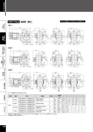IPMギアモータG3タイプ平行軸H2タイプ直交軸F/FAタイプ中空軸・中実軸F3タイプ同心中空軸・同心中実軸モータ部・ブレーキ部仕様制御部仕様技術資料オプションカッコ()の値はブレーキ付ギアモータの表示です。F1406560F1406560140φ40h6φ40h6165165G272.5φ40h6G1401807014018065602070φ40h6272.5165φ40h6φ40h6165165φ40h61652070128140656020701391406560207012814065601406560φ40h6165201401807014018013914065601406560272.5φ40h6165140180R軸概略質量(kg)20.52223.5252426.528.532AB365.5405.5421471.5348396437.5466.5φ115□126φ128□137φ144□154□178□17870C19.519.57.57.5────140180T軸D53.553.549.549.5────272.5φ40h61652070E242.5242.5252252────F110110117117────Gφ142φ142φ165φ165────H2タイプ直交軸軸径40脚取付<図1>φ2043(A)ACD12272.5EFG1201804-φ1514018014065602070Bケーブル引込口φ27<図2>(A)A431281406560Bケーブル引込口φ27<図3>1253.5242.51201804-φ151401802070(A)Aφ204313914012272.525249.5Bケーブル引込口φ271201804-φ15140180L軸注.モータ容量0.2kWは吊り板はありません。65602070φ40h6φ40h6165165相数容量型式減速比図番ブレーキ三相0.2kW0.4kW0.75kW1.5kWH2L40#***□-PM02NVTNH2L40#***□-PM02NVTB2H2L40#***□-PM04NVTNH2L40#***□-PM04NVTB2H2L40#***□-PD08NVTNH2L40#***□-PD08NVTB2H2L40#***□-PD15NVTNH2L40#***□-PD15NVTB2600,750,900,1200,1500300,375,45080,100,120,160,200,2405,10,15,20,25,30,40,50,601123なし付きなし付きなし付きなし付き※型式の#には軸区分記号(L,R,T)が入ります。また、***には減速比、□にはバックラッシ精度(L,N)が入ります。※性能表はP.696をご参照ください。700