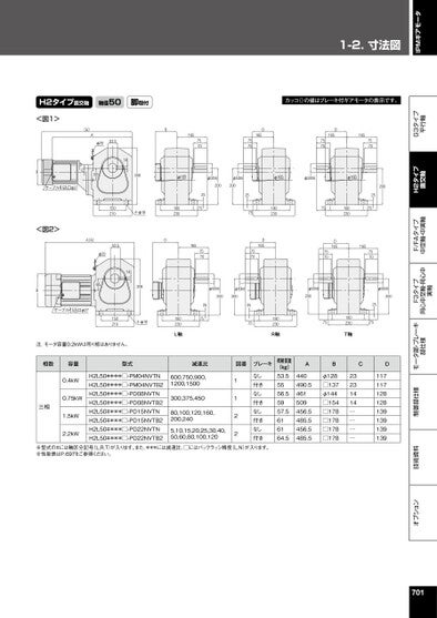 1-2.⼨法図IPMギアモータオプション技術資料制御部仕様モータ部・ブレーキ部仕様F3タイプ同心中空軸・同心中実軸F/FAタイプ中空軸・中実軸H2タイプ直交軸G3タイプ平行軸H2タイプ直交軸軸径50脚取付<図1>(A)Aφ2053.514D1657570BC65ケーブル引込口φ27308φ165φ50h6φ50h6200200<図2>1502104-φ181802302575(A)A53.5φ20D1657570D16575702575D1657570カッコ()の値はブレーキ付ギアモータの表示です。D16575701657570φ165φ50h6φ165180230751802302002575D16575701657570Bケーブル引込口φ2714653081502104-φ18注.モータ容量0.2kWは吊り板はありません。φ50h6φ50h6200200φ50h62002575180230L軸2575180230R軸75180230T軸φ50h62002575相数容量型式減速比図番ブレーキ三相0.4kW0.75kW1.5kW2.2kWH2L50#***□-PM04NVTNH2L50#***□-PM04NVTB2H2L50#***□-PD08NVTNH2L50#***□-PD08NVTB2H2L50#***□-PD15NVTNH2L50#***□-PD15NVTB2H2L50#***□-PD22NVTNH2L50#***□-PD22NVTB2600,750,900,1200,1500300,375,45080,100,120,160,200,2405,10,15,20,25,30,40,50,60,80,100,1201122なし付きなし付きなし付きなし付き※型式の#には軸区分記号(L,R,T)が入ります。また、***には減速比、□にはバックラッシ精度(L,N)が入ります。※性能表はP.697をご参照ください。概略質量(kg)53.55556.55957.5616164.5A440490.5461509456.5485.5456.5485.5BCDφ128□137φ144□154□178□178□178□17823231414────117117128128139139139139701