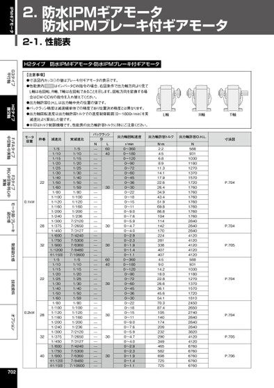IPMギアモータG3タイプ平行軸H2タイプ直交軸F/FAタイプ中空軸・中実軸F3タイプ同心中空軸・同心中実軸モータ部・ブレーキ部仕様制御部仕様技術資料オプション2.防水IPMギアモータ防水IPMブレーキ付ギアモータ2-1.性能表H2タイプ防水IPMギアモータ・防水IPMブレーキ付ギアモータ【注意事項】●寸法図内カッコ()の値はブレーキ付ギアモータの表示です。●性能表内はインバータCW指令の場合、右図条件で出力軸方向より見てL軸は右回転、R軸、T軸は左回転であることを示します。回転方向を変換する場合はCW・CCWの指令を入れ替えてください。●出力軸許容O.H.L.は出力軸中央の位置の値です。●バックラッシ精度は減速機単体での精度であり位置決め精度とは異なります。●出力軸回転速度は出力軸許容トルクでの速度制御範囲(0〜1800r/min)を実減速比より算出した値です。●※印はトルク制限機種です。性能表の出力軸許容トルクに特にご注意ください。L軸R軸T軸モータ容量枠番減速比実減速比1/51/101/151/201/251/301/401/501/601/801/1001/1201/1601/2001/2401/3001/3751/4501/6001/7501/9001/1200※1/15001/51/101/151/201/251/301/401/501/601/801/1001/1201/1601/2001/2401/3001/3751/4501/6001/7501/900※1/1200※1/15001/51/101/151/201/251/301/401/501/591/801/1001/1201/1601/2001/2367/21207/26507/31277/42407/53007/63607/84807/106001/51/101/151/201/251/301/401/501/591/801/1001/1201/1601/2001/2367/21207/26507/31277/42407/53007/63607/84807/106000.1kW222832220.2kW283240702バックラッシ分出力軸回転速度出力軸許容トルク出力軸許容O.H.L.寸法図L6040303030604030303030N——————————————————————————————————————————————r/min0〜3600〜1800〜1200〜900〜720〜600〜450〜360〜300〜220〜180〜150〜110〜9.00〜7.60〜5.90〜4.70〜4.00〜2.90〜2.30〜1.90〜1.40〜1.10〜3600〜1800〜1200〜900〜720〜600〜450〜360〜300〜220〜180〜150〜110〜9.00〜7.60〜5.90〜4.70〜4.00〜2.90〜2.30〜1.90〜1.40〜1.1N・m2.24.56.88.911.314.117.922.626.434.943.451.969.886.81041141421702242813384074074.59.014.218.022.826.636.145.654.170.387.4105140174209232290349465582698725725N588931103011801270137015701720176017601760176017601760176028402840284041204120412041204120588931103011801270137015701720181024502650274028402840284038204120412067606760676067606760P.704P.704P.705P.704P.704P.705P.706