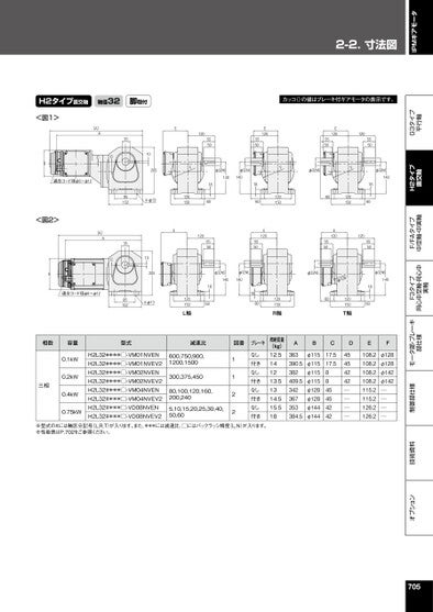 2-2.⼨法図オプション技術資料制御部仕様モータ部・ブレーキ部仕様F3タイプ同心中空軸・同心中実軸F/FAタイプ中空軸・中実軸H2タイプ直交軸G3タイプ平行軸IPMギアモータH2タイプ直交軸軸径32脚取付<図1>(A)A35CDB適合コード径φ8~φ12<図2>10205951524-φ13(A)A35CB適合コード径φ8~φ1210205951524-φ13φ32h6φ32h6140140EEF120150120555018601205550E12055501860E1205550カッコ()の値はブレーキ付ギアモータの表示です。E12055501205550F120150φ32h6F60120150φ32h61401860E12055501205550φ32h6φ32h6140140φ32h6821φφ32h61401860120150L軸1860120150R軸186060120150T軸相数容量型式減速比図番ブレーキ三相0.1kW0.2kW0.4kW0.75kWH2L32#***□-VM01NVENH2L32#***□-VM01NVEV2H2L32#***□-VM02NVENH2L32#***□-VM02NVEV2H2L32#***□-VM04NVENH2L32#***□-VM04NVEV2H2L32#***□-VD08NVENH2L32#***□-VD08NVEV2600,750,900,1200,1500300,375,45080,100,120,160,200,2405,10,15,20,25,30,40,50,601122なし付きなし付きなし付きなし付き概略質量(kg)12.5141213.51314.515.518AB363390.5382409.5342367353384.5φ115φ115φ115φ115φ128φ128φ144φ144C17.517.58845454242DEF45454242────108.2108.2108.2108.2115.2115.2126.2126.2φ128φ128φ142φ142────※型式の#には軸区分記号(L,R,T)が入ります。また、***には減速比、□にはバックラッシ精度(L,N)が入ります。※性能表はP.702をご参照ください。705