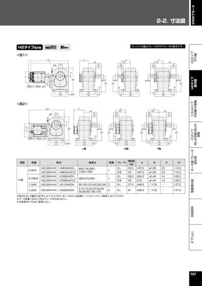 2-2.⼨法図オプション技術資料制御部仕様モータ部・ブレーキ部仕様F3タイプ同心中空軸・同心中実軸F/FAタイプ中空軸・中実軸H2タイプ直交軸G3タイプ平行軸IPMギアモータH2タイプ直交軸軸径50脚取付<図1>カッコ()の値はブレーキ付ギアモータの表示です。D1657570D1657570D16575701657570φ50h6φ50h6200200φ50h62575D165757018023075180230D16575701657570φ50h62002575(A)Aφ2053.5C65143081502104-φ181802302575(A)Aφ2053.565D165757014308B適合コード径φ8~φ12<図2>21.5B適合コード径φ8~φ12φ50h6φ50h6200200φ50h62001502104-φ182575180230L軸2575180230R軸75180230T軸φ50h62002575相数容量型式減速比図番ブレーキ三相0.4kW0.75kW1.5kW2.2kWH2L50#***□-VM04NVENH2L50#***□-VM04NVEV2H2L50#***□-VD08NVENH2L50#***□-VD08NVEV2H2L50#***□-VD15NVENH2L50#***□-VD22NVEN600,750,900,1200,1500300,375,45080,100,120,160,200,2405,10,15,20,25,30,40,50,60,80,100,1201122なし付きなし付きなしなし※型式の#には軸区分記号(L,R,T)が入ります。また、***には減速比、□にはバックラッシ精度(L,N)が入ります。※モータ容量1.5kW・2.2kWブレーキ付はありません。※性能表はP.703をご参照ください。概略質量(kg)53.55556.55957.561A472.5497.5484.5516456.5456.5BCφ128φ128φ144φ144□178□17823231414──D115.2115.2126.2126.2137.2137.2707