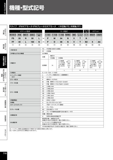 IPMギアモータG3タイプ平行軸H2タイプ直交軸F/FAタイプ中空軸・中実軸F3タイプ同心中空軸・同心中実軸モータ部・ブレーキ部仕様制御部仕様技術資料オプション機種・型式記号FタイプIPMギアモータ・IPMブレーキ付ギアモータ<中空軸/FS、中実軸/FF>ギアヘッド型式モータ型式ブレーキ仕様オプション取付区分枠番軸区分減速比バックラッシ精度モータ区分モータ仕様モータ容量電源電圧規格ターミナルボックスブレーキ補助記号仕様記号FSFF①3540②NL③50160④LN⑤PP⑥MD⑦0408⑧NN⑨VV⑩TT⑪NB2⑫X⑬AA⑭①取付区分②枠番および出力軸径③軸区分④減速比⑤バックラッシ精度(注1)⑥モータ区分⑦モータ仕様⑧モータ容量⑨電源電圧⑩規格⑪ターミナルボックス⑫ブレーキ仕様⑬補助記号⑭仕様記号:中空軸(55枠のみ鋳鉄):中実軸FSFF出力軸径材質軸区分中空軸炭素鋼N中実軸入力軸側(↑)から見て出力軸が左に出るものL入力軸側(↑)から見て出力軸が右に出るものR入力軸側(↑)から見て出力軸が両方に出るものT:バックラッシ精度30分(一部機種除く):ノーマル:標準モータ(IP44):F種標準モータ(0.1kW〜0.4kW):F種標準モータ(0.75kW〜2.2kW):三相0.1kW:三相0.2kW:三相0.4kW:三相0.75kW:三相1.5kW:三相2.2kW:200V〜230V:UL・CE・CCC・cUL注2):T型ターミナルボックス(鋼板):ブレーキなし:200V級ブレーキ付:ブレーキ手動解放装置付200V級ブレーキ付5:1/5〜15X:1/1500LNPMD010204081522NVTNB2J2空欄:標準仕様X整流器内蔵結線指示記号詳細はP.852の仕様記号一覧をご参照ください。ターミナルボックス位置指示記号詳細はP.857の仕様記号一覧をご参照ください。その他仕様記号はP.1249の仕様記号一覧をご参照ください。:特殊仕様追加認識記号注1.バックラッシ精度は減速機単体での精度であり位置決め精度とは異なります。注2.1.5kW、2.2kWはCCC規格品ではありません。710