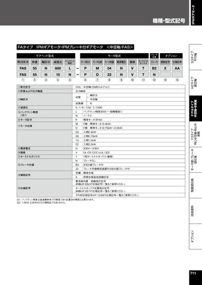 機種・型式記号IPMギアモータオプション技術資料制御部仕様モータ部・ブレーキ部仕様F3タイプ同心中空軸・同心中実軸F/FAタイプ中空軸・中実軸H2タイプ直交軸G3タイプ平行軸FAタイプIPMギアモータ・IPMブレーキ付ギアモータ<中空軸/FAS>ギアヘッド型式モータ型式ブレーキ仕様オプション取付区分枠番軸区分減速比バックラッシ精度モータ区分モータ仕様モータ容量電源電圧規格ターミナルボックスブレーキ補助記号仕様記号FASFAS①5555②NN③60010④LN⑤PP⑥MD⑦0422⑧NN⑨VV⑩TT⑪B2N⑫X⑬AA⑭①取付区分②枠番および出力軸径FAS:中空軸(55枠のみアルミ)出力軸径③軸区分④減速比⑤バックラッシ精度(注1)⑥モータ区分⑦モータ仕様⑨電源電圧⑩規格⑪ターミナルボックス⑫ブレーキ仕様⑬補助記号⑭仕様記号材質軸区分中空軸N:バックラッシ精度30分(一部機種除く):ノーマル:標準モータ(IP44):F種標準モータ(0.4kW):F種標準モータ(0.75kW〜2.2kW):三相0.4kW:三相0.75kW:三相1.5kW:三相2.2kW:200V〜230V:UL・CE・CCC・cUL注2):T型ターミナルボックス(鋼板):ブレーキなし:200V級ブレーキ付:ブレーキ手動解放装置付200V級ブレーキ付炭素鋼5:1/5〜15X:1/1500LNPMD04081522NVTNB2J2空欄:標準仕様X整流器内蔵結線指示記号詳細はP.852の仕様記号一覧をご参照ください。ターミナルボックス位置指示記号詳細はP.857の仕様記号一覧をご参照ください。その他仕様記号はP.1249の仕様記号一覧をご参照ください。:特殊仕様追加認識記号注1.バックラッシ精度は減速機単体での精度であり位置決め精度とは異なります。注2.1.5kW、2.2kWはCCC規格品ではありません。711