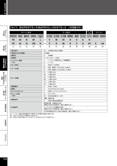 IPMギアモータG3タイプ平行軸H2タイプ直交軸F/FAタイプ中空軸・中実軸F3タイプ同心中空軸・同心中実軸モータ部・ブレーキ部仕様制御部仕様技術資料オプションFタイプ防水IPMギアモータ・防水IPMブレーキ付ギアモータ<中空軸/FS>ギアヘッド型式モータ型式ブレーキ仕様オプション取付区分枠番軸区分減速比バックラッシ精度モータ区分モータ仕様モータ容量電源電圧規格ターミナルボックスブレーキ補助記号仕様記号FSFS①3545②NN③50160④LN⑤VV⑥MD⑦0408⑧NN⑨VV⑩EE⑪NV2⑫X⑬AA⑭①取付区分②枠番および出力軸径③軸区分④減速比⑤バックラッシ精度(注1)⑥モータ区分⑦モータ仕様⑧モータ容量⑨電源電圧⑩規格⑪ターミナルボックス⑫ブレーキ仕様(注3)⑬補助記号⑭仕様記号:中空軸(55枠のみ鋳鉄):炭素鋼:バックラッシ精度30分(一部機種除く):ノーマル:防水モータ(IP65):F種標準モータ(0.1kW〜0.4kW):F種標準モータ(0.75kW〜2.2kW):三相0.1kW:三相0.2kW:三相0.4kW:三相0.75kW:三相1.5kW:三相2.2kW:200V〜230V:UL・CE・CCC・cUL注2):E型ターミナルボックス(アルミ):ブレーキなし:防水200V級ブレーキ付FS出力軸径N5:1/5〜15X:1/1500LNVMD010204081522NVENV2空欄:標準仕様X整流器内蔵結線指示記号詳細はP.852の仕様記号一覧をご参照ください。ターミナルボックス位置指示記号詳細はP.857の仕様記号一覧をご参照ください。その他仕様記号はP.1249の仕様記号一覧をご参照ください。:特殊仕様追加認識記号注1.バックラッシ精度は減速機単体での精度であり位置決め精度とは異なります。注2.1.5kW、2.2kWはCCC規格品ではありません。注3.1.5kW、2.2kWの防水ブレーキ付ギアモータはありませんのでご注意ください。712