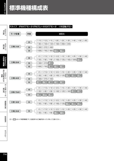 IPMギアモータG3タイプ平行軸H2タイプ直交軸F/FAタイプ中空軸・中実軸F3タイプ同心中空軸・同心中実軸モータ部・ブレーキ部仕様制御部仕様技術資料オプション標準機種構成表FタイプIPMギアモータ・IPMブレーキ付ギアモータ<中空軸/FS>モータ容量枠番減速比三相0.1kW三相0.2kW三相0.4kW三相0.75kW三相1.5kW三相2.2kW253035303545354555455555551/101/12.51/151/201/251/301/401/501/601/801/1001/1201/1601/2001/2401/3001/3751/4501/6001/7501/9001/12001/15001/51/7.51/501/601/101/801/3001/3751/4501/12.51/151/201/251/301/401/1001/1201/1601/2001/2401/6001/7501/9001/12001/15001/51/7.51/501/601/101/801/3001/3751/4501/12.51/151/201/251/301/401/1001/1201/1601/2001/2401/6001/7501/9001/12001/15001/51/7.51/101/12.51/151/201/251/301/401/501/601/801/1001/1201/1601/2001/2401/3001/3751/4501/51/7.51/101/12.51/151/201/251/301/401/501/601/801/1001/1201/1601/2001/2401/51/7.51/101/12.51/151/201/251/301/401/501/601/801/1001/120注1.はトルク制限機種です。性能表の出力軸許容トルクに特にご注意ください。714