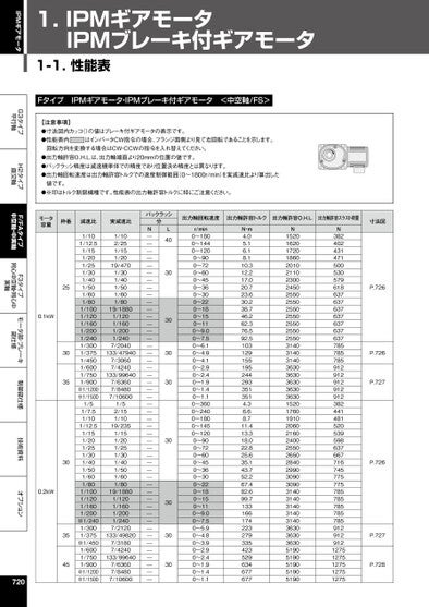 IPMギアモータG3タイプ平行軸H2タイプ直交軸F/FAタイプ中空軸・中実軸F3タイプ同心中空軸・同心中実軸モータ部・ブレーキ部仕様制御部仕様技術資料オプション1.IPMギアモータIPMブレーキ付ギアモータ1-1.性能表FタイプIPMギアモータ・IPMブレーキ付ギアモータ<中空軸/FS>【注意事項】●寸法図内カッコ()の値はブレーキ付ギアモータの表示です。●性能表内はインバータCW指令の場合、フランジ面側より見て右回転であることを示します。回転方向を変換する場合はCW・CCWの指令を入れ替えてください。●出力軸許容O.H.L.は、出力軸端面より20mmの位置の値です。●バックラッシ精度は減速機単体での精度であり位置決め精度とは異なります。●出力軸回転速度は出力軸許容トルクでの速度制御範囲(0〜1800r/min)を実減速比より算出した値です。●※印はトルク制限機種です。性能表の出力軸許容トルクに特にご注意ください。モータ容量枠番減速比実減速比1/101/12.51/151/201/251/301/401/501/601/801/1001/1201/1601/2001/2401/3001/3751/4501/6001/7501/900※1/1200※1/15001/51/7.51/101/12.51/151/201/251/301/401/501/601/801/1001/1201/1601/200※1/2401/3001/375※1/4501/6001/7501/900※1/1200※1/15000.1kW0.2kW25303530354572019/4701/102/251/151/201/301/401/501/601/8019/18801/1201/1601/2001/2407/2040133/479407/30607/4240133/996407/63607/84807/1060019/2351/52/151/101/151/201/251/301/401/501/601/8019/18801/1201/1601/2001/2407/2120133/498207/31807/4240133/996407/63607/84807/10600バックラッシ分出力軸回転速度出力軸許容トルク出力軸許容O.H.L.出力軸許容スラスト荷重寸法図L403030303030303030N————————————————————————————————————————————————r/min0〜1800〜1440〜1200〜900〜720〜600〜450〜360〜300〜220〜180〜150〜110〜9.00〜7.50〜6.10〜4.90〜4.10〜2.90〜2.40〜1.90〜1.40〜1.10〜3600〜2400〜1800〜1450〜1200〜900〜720〜600〜450〜360〜300〜220〜180〜150〜110〜9.00〜7.50〜5.90〜4.80〜3.90〜2.90〜2.40〜1.90〜1.40〜1.1N・m4.05.16.18.110.312.217.020.723.630.238.746.262.376.592.51031291551952442933513514.36.68.711.413.318.022.825.635.143.752.267.482.699.7133166174223279335423529634677677N152016201720186020102110230024502550255025502550255025502550314031403140363036303630363036301520176019102060216024002550265028402990309030903140314031403140314036303630363051905190519051905190N38240243147150053057961863763763763763763763778578578591291291291291238244148152053959863766771674577577578578578578578591291291212751275127512751275P.726P.726P.727P.726P.727P.728