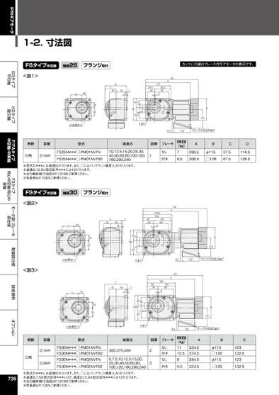IPMギアモータG3タイプ平行軸H2タイプ直交軸F/FAタイプ中空軸・中実軸F3タイプ同心中空軸・同心中実軸モータ部・ブレーキ部仕様制御部仕様技術資料オプションFSタイプ中空軸軸径25フランジ取付カッコ()の値はブレーキ付ギアモータの表示です。8.5102ケーブル引込口φ27B110(A)A54.544147892.5821154.5441316676.528.34-φ1115912DC40114.5φ662828504-M6深さ14<図1>相数容量型式減速比図番ブレーキ概略質量(kg)AB三相0.1kWFS25N***□-PM01NVTNFS25N***□-PM01NVTB210,12.5,15,20,25,30,40,50,60,80,100,120,160,200,2401なし付き78.5268.5308.5φ115□126C57.567.5D116.5126.51-2.⼨法図※型式の***には減速比が入ります。また、□にはバックラッシ精度(L,N)が入ります。※減速比12.5は型式記号***には12が入ります。※出力軸詳細寸法図はP.1218をご参照ください。※性能表はP.720をご参照ください。FSタイプ中空軸軸径30フランジ取付<図2>7333C42651416250(A)A170.5164102908B1108.5102ケーブル引込口φ27(A)A116250164810290C42651143355115φ625014633.372844-φ1173334-M8深さ17B1108.5102ケーブル引込口φ2715.51162501467233.3844-φ113355115φ4-M8深さ17<図3>相数容量型式減速比図番ブレーキ三相0.1kW0.2kWFS30N***□-PM01NVTNFS30N***□-PM01NVTB2FS30N***□-PM02NVTNFS30N***□-PM02NVTB2300,375,4505,7.5,10,12.5,15,20,25,30,40,50,60,80,100,120,160,200,24023なし付きなし付き概略質量(kg)1112.589.5ABC334.5374.5284.5324.5φ115□126φ115□126123132.5123132.5726※型式の***には減速比が入ります。また、□にはバックラッシ精度(L,N)が入ります。※減速比7.5は型式記号***には7、減速比12.5は型式記号***には12が入ります。※出力軸詳細寸法図はP.1218をご参照ください。※性能表はP.720をご参照ください。