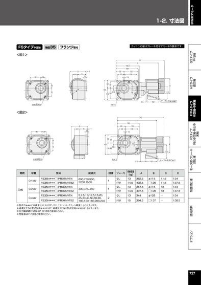 1-2.⼨法図IPMギアモータオプション技術資料制御部仕様モータ部・ブレーキ部仕様F3タイプ同心中空軸・同心中実軸F/FAタイプ中空軸・中実軸H2タイプ直交軸G3タイプ平行軸727FSタイプ中空軸軸径35フランジ取付カッコ()の値はブレーキ付ギアモータの表示です。(A)A198.5188120108106856C16B1108.5102ケーブル引込口φ27B117(A)A16685618810120108685616838.3881004-φ13685616838.3100884-φ1337.5102ケーブル引込口φ27D4470161128φD4470116<図1>90384-M8深さ20<図2>90384-M8深さ2038703870相数容量型式減速比図番ブレーキ三相0.1kW0.2kW0.4kWFS35N***□-PM01NVTNFS35N***□-PM01NVTB2FS35N***□-PM02NVTNFS35N***□-PM02NVTB2FS35N***□-PM04NVTNFS35N***□-PM04NVTB2600,750,900,1200,1500300,375,4505,7.5,10,12.5,15,20,25,30,40,50,60,80,100,120,160,200,240112なし付きなし付きなし付き概略質量(kg)1314.51314.51315A362.5402.5367.5407.5344394.5BCφ115□126φ115□126φ128□13711.511.51818──D134137.5134137.5134138.5※型式の***には減速比が入ります。また、□にはバックラッシ精度(L,N)が入ります。※減速比7.5は型式記号***には7、減速比12.5は型式記号***には12が入ります。※出力軸詳細寸法図はP.1218をご参照ください。※性能表はP.720をご参照ください。